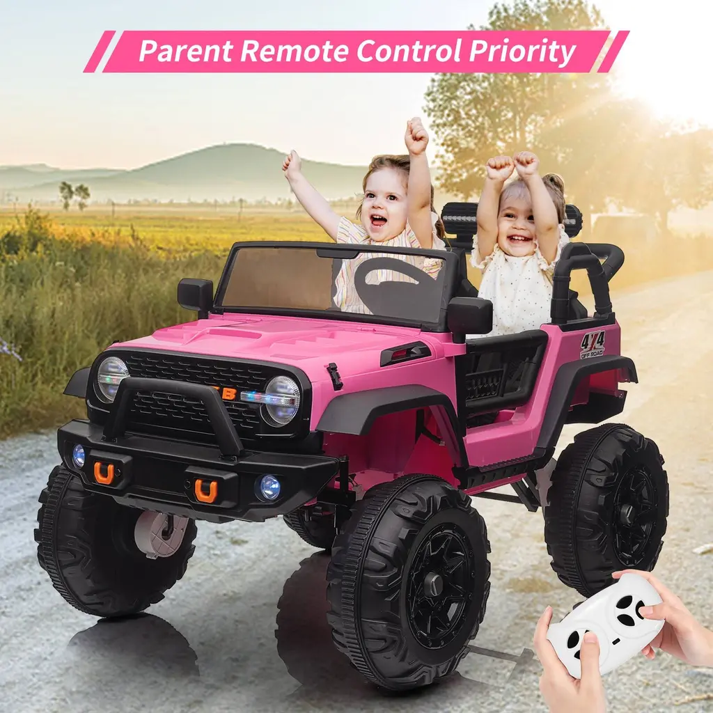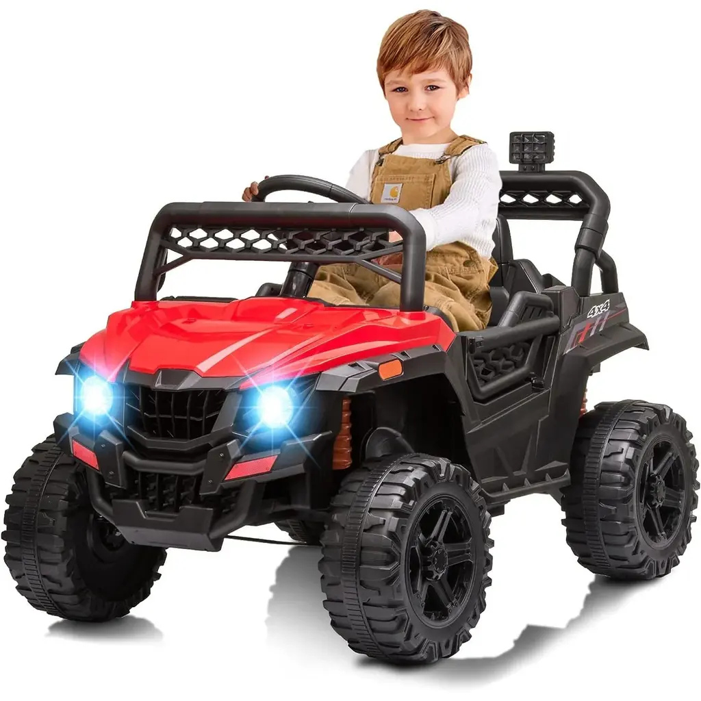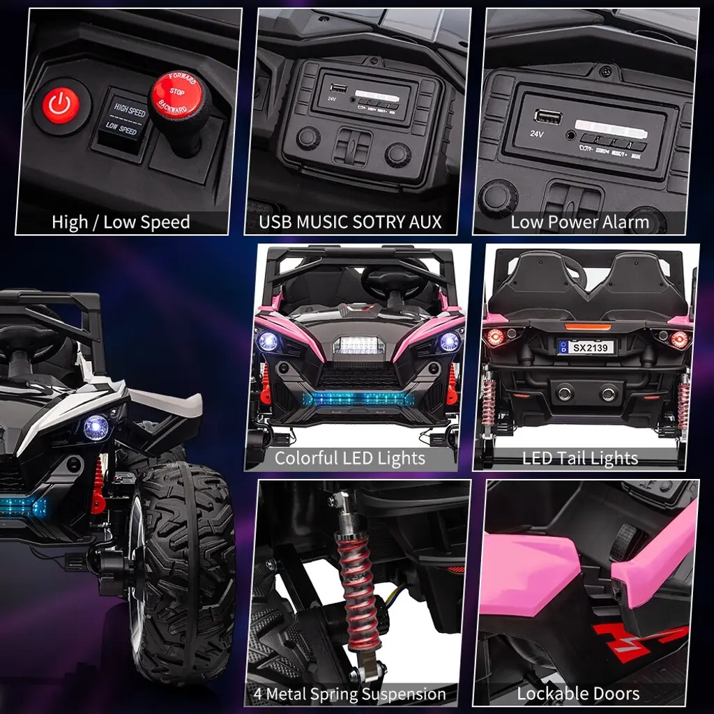 Powerful 24V 10ah Battery & 4 Motors: This 2-seat UTV is equipped with 80W2 and 120W2 motors, providing robust power for an exciting off-road experience. Coupled with 17" extra-large EVA wheels, it excels in various terrains, delivering continuous power and performance in any condition.Spacious and Comfortable Seating: With an overall size of 49.6"*40.9"*30.5" (L x W x H) and a wide 20.5" seat, this UTV is designed to comfortably accommodate two kids (under 4 years) or a single child aged 37 months to 8 years old. It includes two seats with individual safety belts for secure rides.Vibrant LED Lights and Entertainment Features: The ride-on vehicle features dazzling front and tail LED lights, along with music, USB connectivity, and a horn, enhancing the fun for children. The smooth and quiet EVA wheels ensure a pleasant driving experience while meeting safety standards certified by ASTM and CPC.Flexible Control Options: Parents can engage in the fun with the remote control feature, allowing them to operate the vehicle while children can also drive it independently using the foot pedal to control speeds. Each wheel has an independent bearing for smoother steering and enhanced maneuverability.Two-Pack Delivery for Convenience: Due to logistics restrictions, the UTV is delivered in two packages that may arrive on different days. After receiving both boxes, parents can easily follow the installation video and user manual to set up the vehicle for their child's enjoyment.