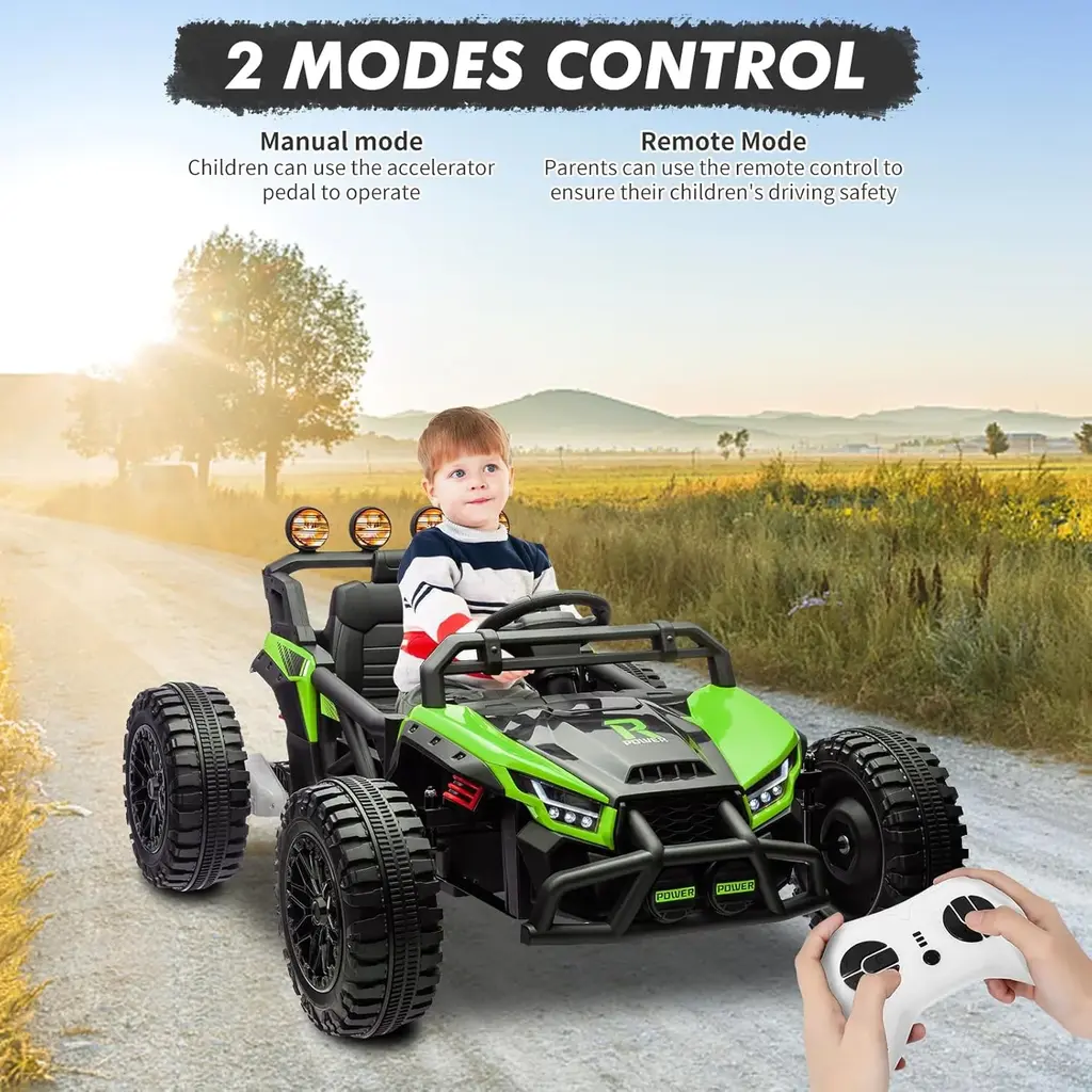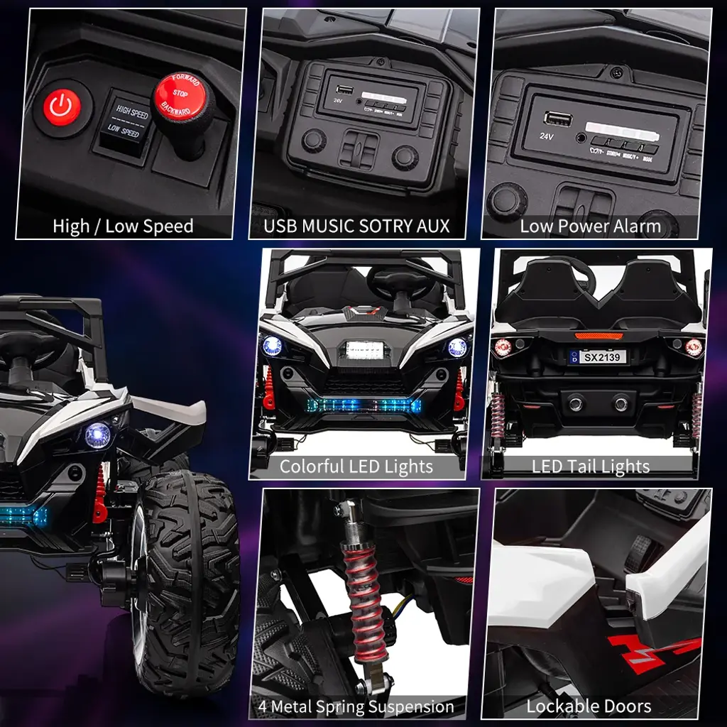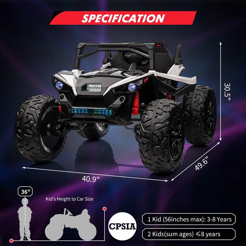 Powerful 24V 10ah Battery & 4 Motors: This 2-seat UTV is equipped with 80W2 and 120W2 motors, providing robust power for an exciting off-road experience. Coupled with 17" extra-large EVA wheels, it excels in various terrains, delivering continuous power and performance in any condition.Spacious and Comfortable Seating: With an overall size of 49.6"*40.9"*30.5" (L x W x H) and a wide 20.5" seat, this UTV is designed to comfortably accommodate two kids (under 4 years) or a single child aged 37 months to 8 years old. It includes two seats with individual safety belts for secure rides.Vibrant LED Lights and Entertainment Features: The ride-on vehicle features dazzling front and tail LED lights, along with music, USB connectivity, and a horn, enhancing the fun for children. The smooth and quiet EVA wheels ensure a pleasant driving experience while meeting safety standards certified by ASTM and CPC.Flexible Control Options: Parents can engage in the fun with the remote control feature, allowing them to operate the vehicle while children can also drive it independently using the foot pedal to control speeds. Each wheel has an independent bearing for smoother steering and enhanced maneuverability.Two-Pack Delivery for Convenience: Due to logistics restrictions, the UTV is delivered in two packages that may arrive on different days. After receiving both boxes, parents can easily follow the installation video and user manual to set up the vehicle for their child's enjoyment.