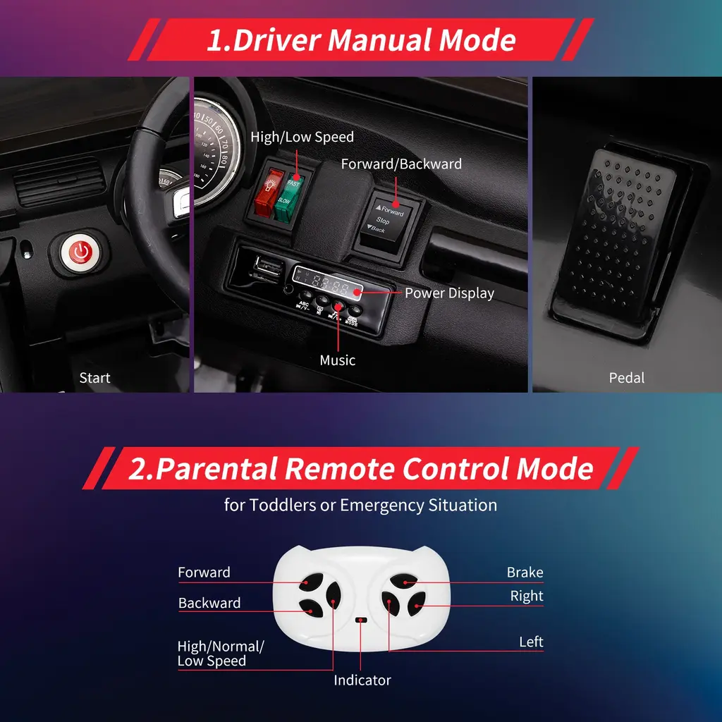Introducing our Ride-On Vehicle, a fun and exciting toy for children. This vehicle includes features such as an MP3 player, USB port, bright LED headlights, and taillights. Play Time: With a full charge after 8-12 hours, the ride-on vehicle offers a playtime of 1.5-2.5 hours, allowing your child to have endless fun.Equipped with a 24V 7ah battery and four powerful 45W motors. The vehicle measures 47.6" in length, 33" in width, and 32.3" in height, with a seat width of 19.7". It can easily accommodate two children under 4 years old or one child aged 3-8 years old. It features two seats with two single safety belts for the utmost security. Parental and Child Control: The ride-on vehicle can be controlled by parents using the included remote control, allowing them to share in the joy of driving with their child. Alternatively, children can operate the vehicle themselves using the foot pedal to control the ideal speeds. Each wheel has an independent bearing, ensuring smooth and effortless steering. Two Package Delivery: Please note that due to logistics restrictions, the ride-on car will be delivered in two separate packages. Please be patient and wait for both packages to arrive. Once you have received both boxes, you can follow the installation video and user manual to assemble the truck.