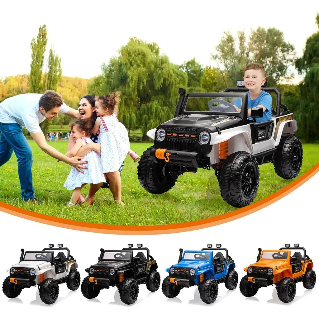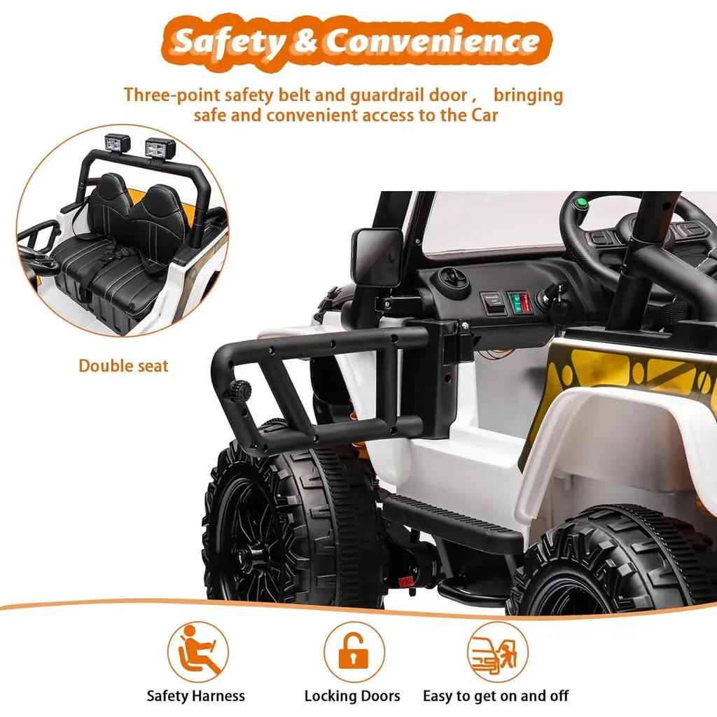 Spacious Dual-Seater Fun: Featuring a 19-inch dual seat, this 24v kids ride on car is perfect for siblings or friends to enjoy together. It is ideal for a larger child, offering comfortable seating with left-side driving and two-seat driving for a more realistic car experience. Safety Features: Equipped with two individual 3-point seat belts and anti-slip seats, this ride on cars for kids ages 3-8 prioritizes safety with parental remote control and rear shock function. It ensures a secure and smooth ride, allowing parents to confidently let their children drive and explore.. Endless Entertainment: Packed with music, connectivity, and a built-in radio, this 24v ride on car with remote control offers more delight. Kids can groove to their favorite tunes and enjoy stories while driving, making every ride a fun-filled and immersive experience. It also creates an independent and immersive space for children, reducing crying and easing the burden on parents. Ideal Gift for Kids:Our battery powered electric vehicle can adapt to various terrains, whether on grass, gravel, yard or park All can drive smoothly and safely. it is a attractive gift for kids age 3+ at Birthday, Thanksgiving Day, Christmas, New Year, etc. it can be a surprising gift for your children or grandchildren. SPECIFICATIONS : Overall size: 48.62"*27.68"*28.07"(L x W x H). Maximum Load: 220LBS. Speed: 2-4 MPH(3-7KM/H). Motor: 24V/ 4X55W. Playtime: 1~2 Hours(Fluctuates according to factors like load, speed, road surface & temperature). Other Functions: Wireless music player, powerful truck lights and real car engine sound.