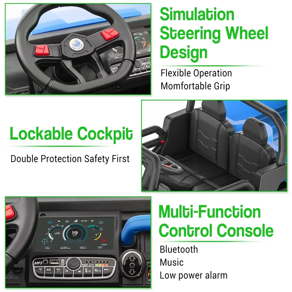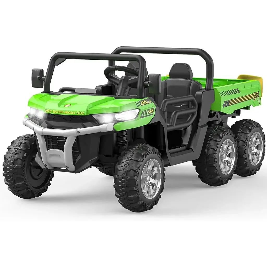 Dump Truck w/Parent Remote Control - Hetoy dump truck has two driving modes designed to be suitable for kid of different ages, let your kid can play from 1 to 8 years old. 1 to 3 years old can use the remote control mode, enjoy the time of parents and children together. 3 to 8 years old can use the driving mode, so that kid can experience the fun of driving. 24V Battery Powered w/4WD 6 Wheels Ride Truck - This dump truck is powered by a 24V rechargeable battery, and driven by 4pcs 75W motors. Max speed is up to 5mph. 20 Inch wide 2-seater is for 2 little kids or 1 to play together. 2 Seaters Truck w/ Electric Dump Bed - Our ride on truck equipped with 2 seaters and came with the a safety belt that can protect kids during driving. Tipping bucket trunk design, can let the children experience the real joy of loading and unloading. Multi-Function Control Console - Easy to start by one key. This electric dump truck features music, horn, headlights, high/low speed function and phone connections, which enables the kids can enjoy the rear driving experience with this car. Best Gift for kids - Our kids ride-on dump truck is made of safe material and equipped with multiple functions that can enrich your little one's life and enhance parent-child relationship. Certificated with ASTM and CPSIA, it can be a surprising Christmas gift or birthday gift for your children or grandchildren.