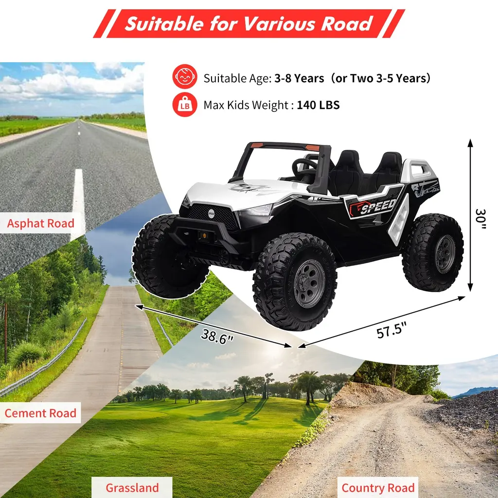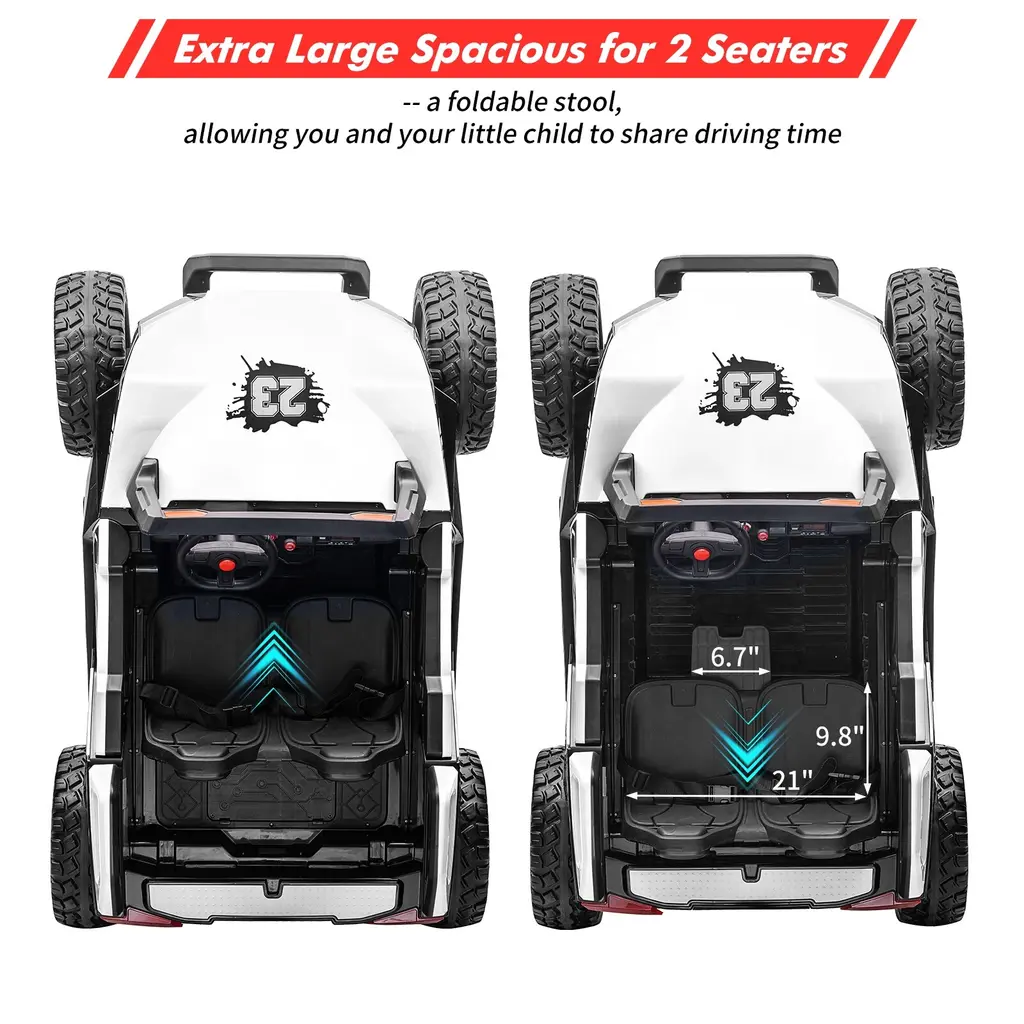 This 2 seater ride on car for kids features both manual and remote control modes. Kids can drive the car independently using the foot pedal and steering wheel, while parents can take control using the remote control. The remote also has an emergency brake function for added safety. Featuring a spacious design suitable for children from early childhood to their teenage years, this kids' car includes a music panel that supports USB, TF card, and AUX port connectivity, enabling kids to enjoy their favorite tunes while cruising. This kids electric car certified by CPSIA, with slow start function,parent remote control, adjustable 2 seats with belts ,15.4" large size EVA shock obsorbing tires and metal spring suspension, all these can make sure to prevent your child from falling off or other danger.The seats can be adjusted forward and backward according to the length of the child's legs.