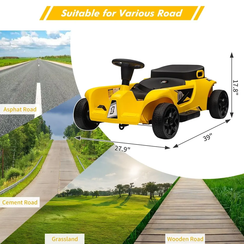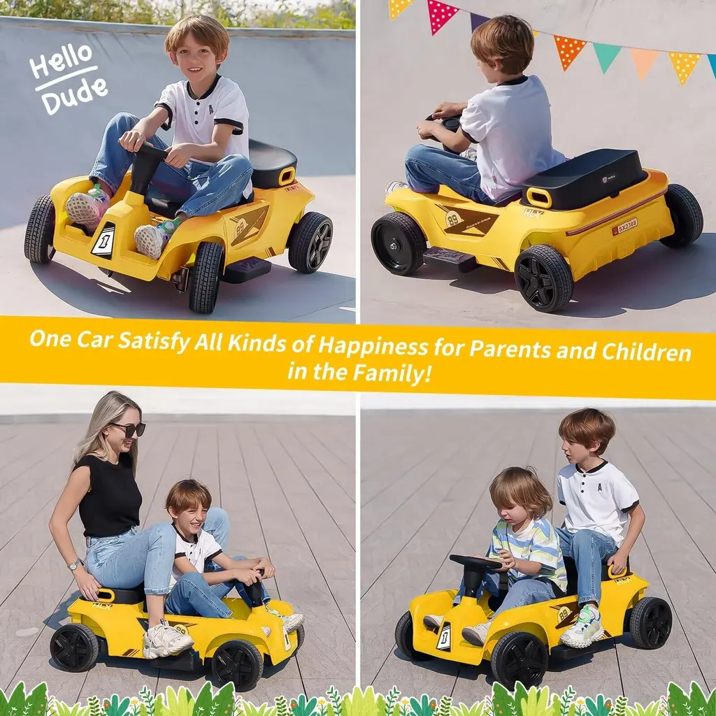 Family Fun Experience: This parent-child ride-on car accommodates one child, two children, or a child accompanied by a parent. It's perfect for older kids to enjoy with younger siblings while parents guide them in learning to drive. This playful experience helps enhance children's hand-eye coordination, making it a fantastic gift for kids. Comfortable and Safe Ride: Featuring an open design, this electric vehicle allows both big and small kids to ride together, with a maximum load capacity of 200 lbs and a safe top speed of 4 MPH. The EVA tires and open structure ensure effective shock absorption for a comfortable ride, while the removable back seat doubles as storage for snacks and drinks during outings. Versatile Driving Modes: This ride-on car offers multiple speed control options, allowing the driver or backseat passenger to manage speeds. It includes high and low-speed buttons, plus a parental remote control with a priority mode and emergency braking function (P gear) to enhance safety. The car also features built-in music for added enjoyment while driving. Compact and Convenient Storage: With overall dimensions of 39"L x 28"W x 18"H, this car is designed for easy storage. Unlike other tandem vehicles, it can be placed on shelves when not in use, making it a space-saving option that is convenient for households with limited storage. Ideal Gift for Children: This ride-on toy is suitable for children from toddlers up to eight years old, offering long-lasting use with minimal height and weight restrictions. It makes an excellent gift for toddlers, kids, grandchildren, or families with multiple children, ensuring everyone can join in on the fun.