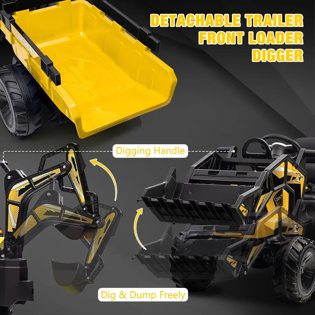 【Kids Ride on Tractor, one car with multiple functions】 This Kids Ride on Tractor comes with Trailer, Shovel Bucket, Digger, and has 3 modes of use: tractor, excavator and bulldozer. Children can enjoy the fun brought by the 3 vehicles! 【Two control modes】 This Kids Ride on Tractor has a remote control. If the child is small, parents can use the remote control to interact with the child. At the same time, the older child can also use the pedal to control the tractor and switch between high and low speed. Forward/backward, 2 modes, easy control 【Two control modes】 This Kids Ride on Tractor has a remote control. If the child is small, parents can use the remote control to interact with the child. At the same time, the older child can also use the pedal to control the tractor and switch between high and low speed. Forward/backward, 2 modes, easy control 【Powerful Performance, High Quality and Safety】The kids tractor car is equipped with 4 non-slip, shock-absorbing and wear-resistant wheels made of high-quality EVA, with seat belts and headlights, ensuring children to drive safely on different road surfaces and environments. This Kids Ride on Tractor is powered by 24V/7Ah x 2 rechargeable batteries, 80W motor, which can ensure about one hour of play time after fully charged, reaching a speed between 1.8-5.0 mph 【Perfect gift】Buying this Kids Ride on Tractor is equivalent to buying 3 types of engineering vehicles. The child fastens the seat belt, presses the power switch, and depresses the accelerator pedal to start, just like a real engineering vehicle. Get this car for your kids now! (Note: There are two boxes for this tractor ride, please be patient and wait for both boxes to be delivered before assembly)