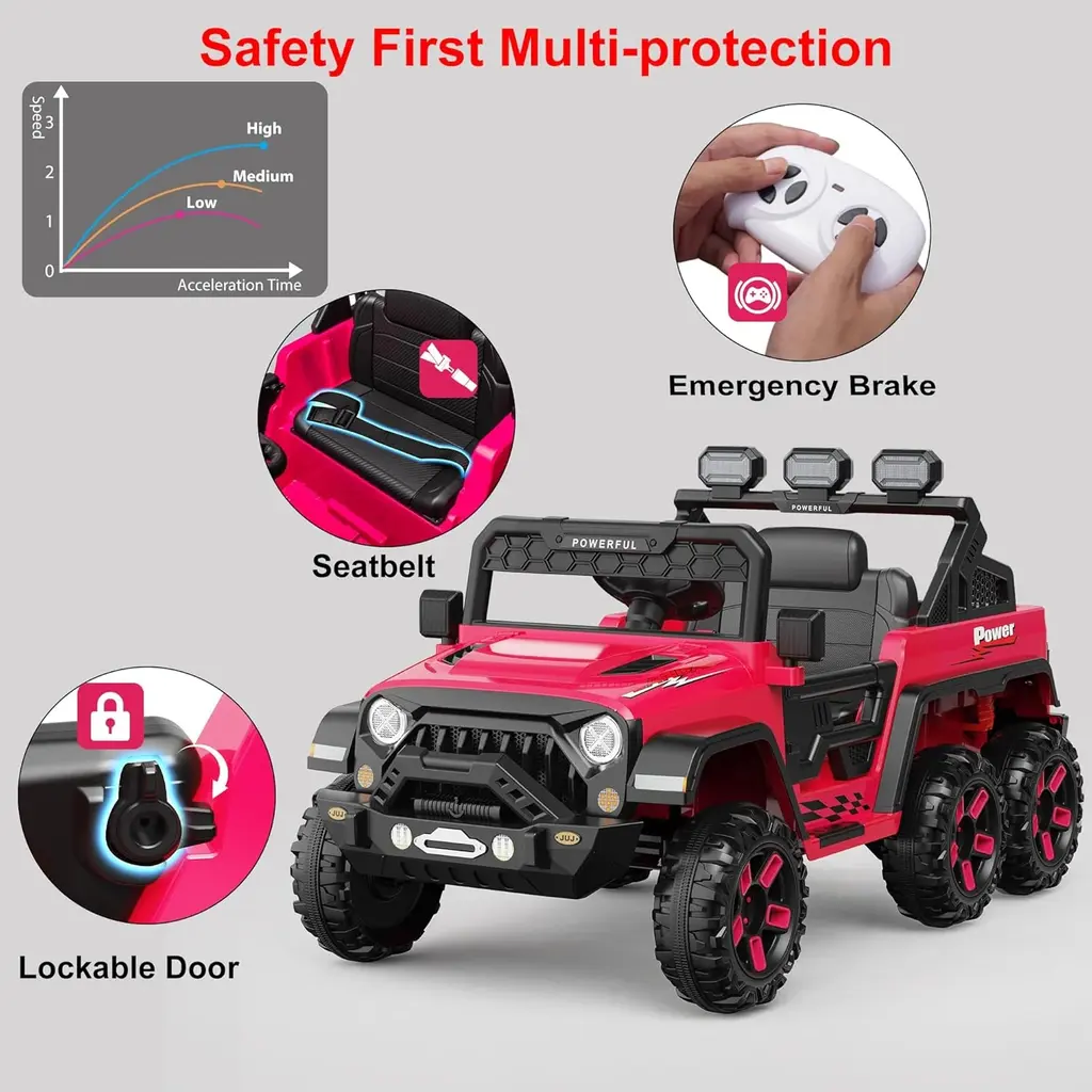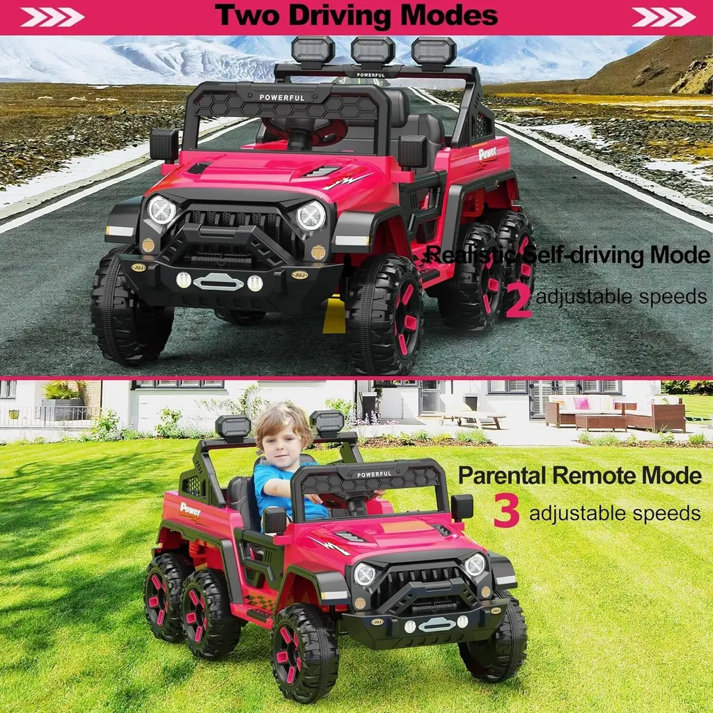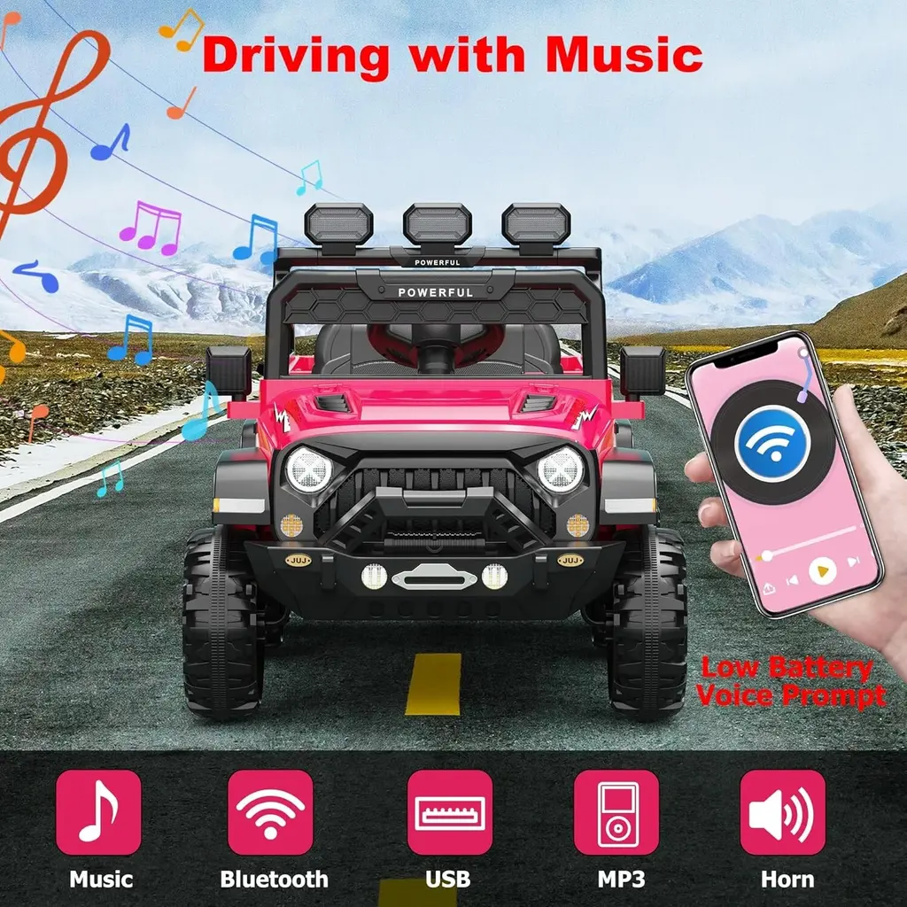 Long Range & 4WD Capability: This 24-volt electric ride-on toy car is equipped with a 24V 7Ah rechargeable battery and four powerful motors, allowing it to drive at speeds of 1.2-3.7 MPH on various terrains like grass, asphalt, brick, and cobbled roads for approximately 2 hours. The battery level display and low battery voice prompt help keep track of power levels. Two Driving Modes: Children can operate the vehicle manually using pedals and steering, while a 2.4G remote control allows parents to easily switch between high and low speeds, engage the brakes, and control direction with three adjustable speed settings. This dual functionality offers independent driving for kids and added safety for parents. Safety is a Priority: Designed with safety in mind, this ride-on truck features a parental remote control that enables parents to stop the vehicle, adjust speed, or change direction while kids are driving. Safety features include a safety belt, lockable doors, and a soft start design to prevent sudden acceleration. The non-inflatable EVA wheels ensure a smooth, safe ride. Realistic Driving Experience: The electric motorized car provides a realistic driving experience with a non-slip foot pedal for acceleration, deceleration, and braking. The kid-friendly steering wheel is designed with rounded edges and includes interactive horn and engine sound buttons, while features like a windshield and rearview mirror enhance the authenticity of the ride. Driving with Music: Kids can connect their phones via Bluetooth or USB to play their favorite music or stories while riding. The built-in music system and colorful multi-function control console are designed to engage children's senses, adding an entertaining element to their driving adventures.