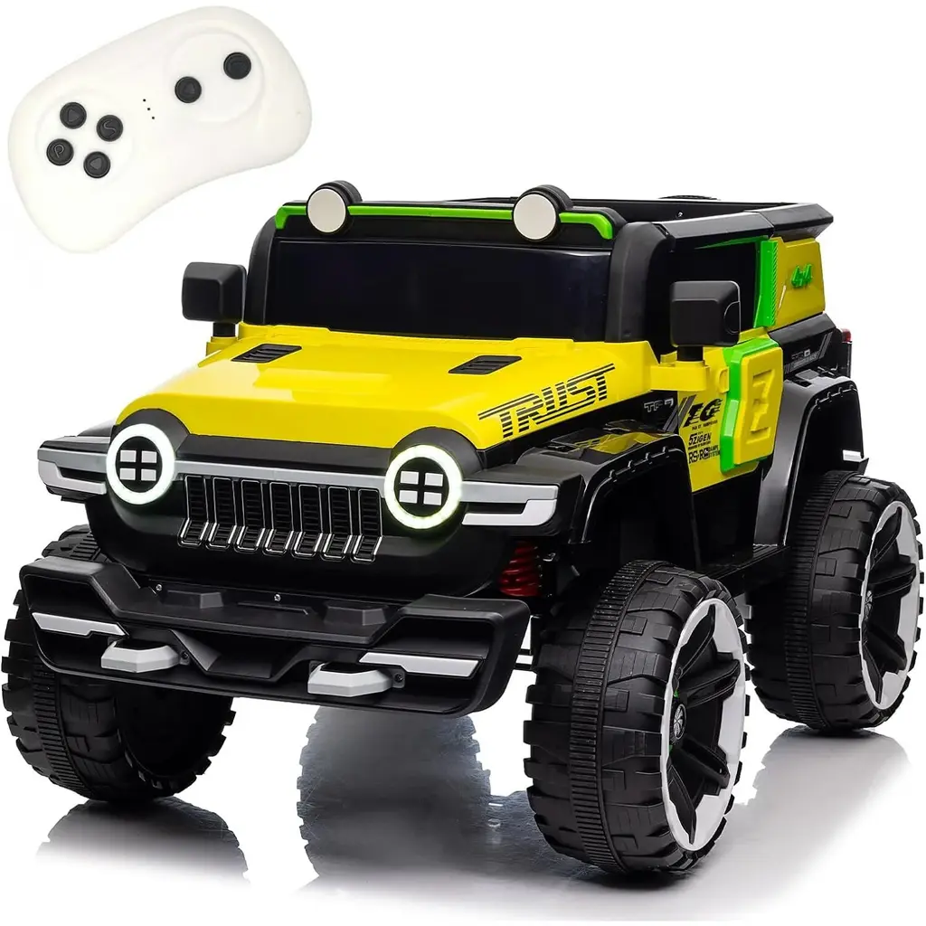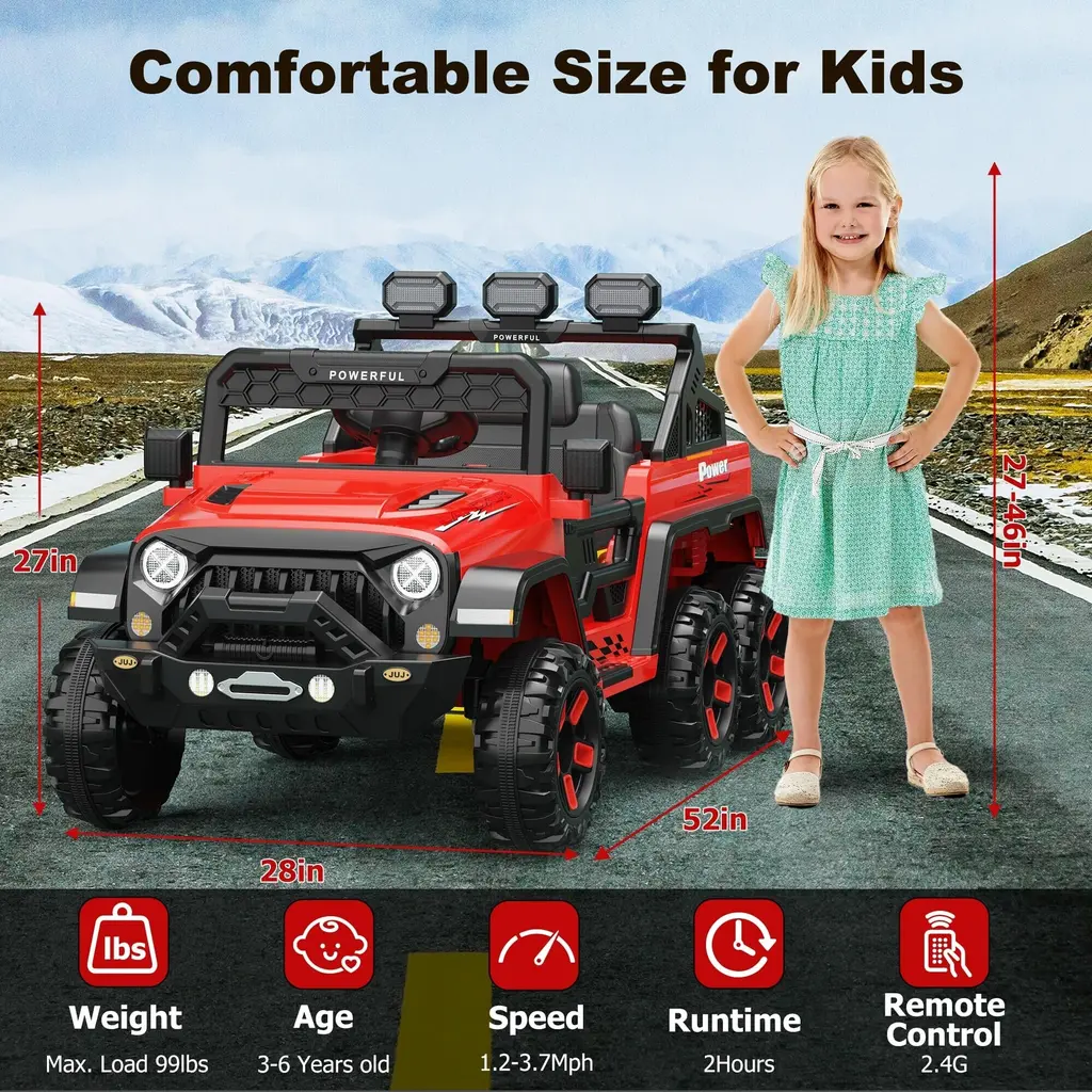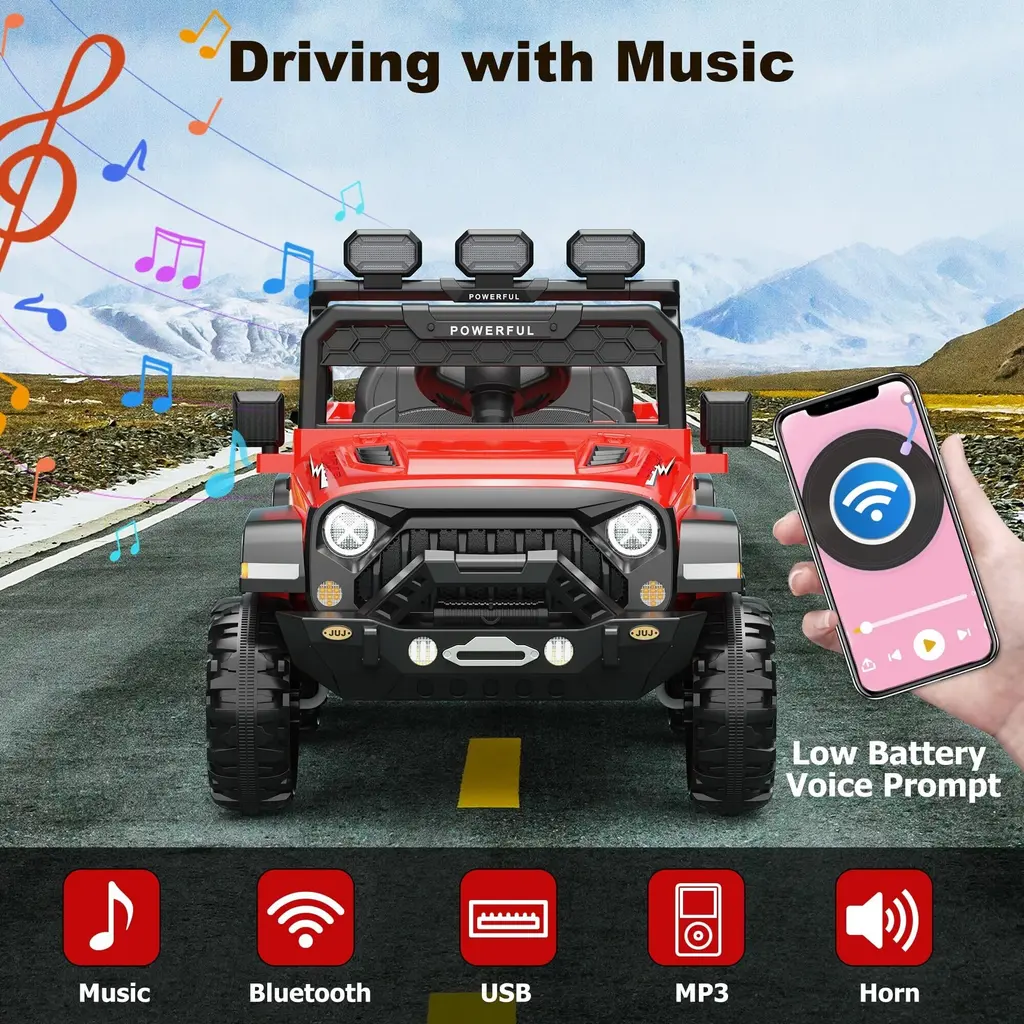 LONG RANGE&4WD:This 24 volt Electric Ride On toy car is powered by 24V 7Ah rechargeable battery, matching with 4 powerful motors,6 EVA wheels, enables you to drive 1.2-3.7mph on varied terrain such as grassland, Asphalt, Brick, Cobbled road for around 2 hours. Battery level display and low battery Voice Prompt to keep the battery level under control. TWO DRIVING MODES:Your kid can operate the pedals and steering to steer the car to drive. With only a single click, the power wheels can be turned on or off and offers high and low speeds. The steering can be moved left, right, forward, and backward with the supplied 2.4G remote control. It has 3 adjustable speeds. Naturally, parents only need to click to engage the brakes. SAFETY IS PRIORITY:The Ride on truck Car with parental remote control is equipped with various safety features, While kids driving, parent can always stop the moving car, change the speed or steering direction to avoid impacts. Parent control always takes over kid's manual control to ensure kids safety. The safety belt, lockable door, and soft start design help prevent children from being startled by sudden acceleration. The non-inflatable EVA wheels provide exceptionally smooth rides. REALISTIC DRIVING EXPERIENCE:Kids can control scoot electric motorized car acceleration, deceleration, and braking with the realistic non-slip foot pedal. The steering wheel is kid-friendly with rounded edges, a comfortable grip, and interactive horn and engine sound buttons. Enhancing the realistic experience are the windshield and rearview mirror. DRIVING WITH MUSIC: The kids battery powered vehicles allows you to connect your phone bluetooth or via USB to play music or stories for your little ones. With built-in music and Colorful multi-function control console, the battery car for will captivate any toddler's senses.
