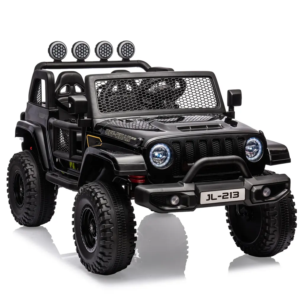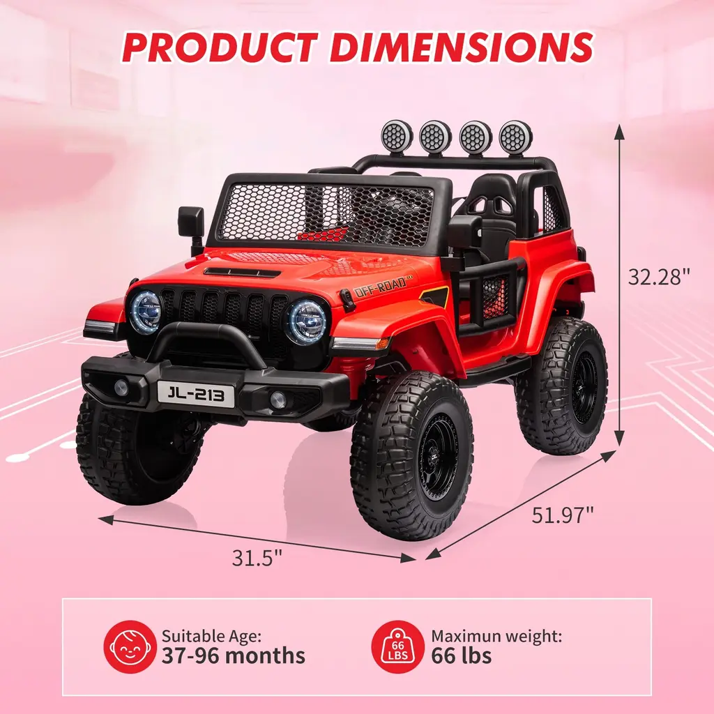 Advanced Performance Features: This electric ride-on car is equipped with a 24V 7AH rechargeable battery housed in a secure battery box and a powerful 4*75W motor that can easily switch between 2WD and 4WD modes. The robust motor ensures stable power for smooth navigation over various obstacles, while the full metal suspension system enhances shock absorption, providing a comfortable ride on rough terrains. Driving Modes & Parental Control: The ride-on toy offers two driving modes suitable for different age groups, allowing kids to drive independently using electric pedals and steering or enabling parents to take control with a 2.4GHz remote control. This feature fosters shared moments of joy, and the convenient front storage area keeps the remote safe after use. Realistic and Entertaining Design: With bright LED headlights, taillights, durable tires, and a multi-function dashboard, this ride-on toy delivers a realistic driving experience. Features like an adjustable seatbelt, lockable doors, grid windshield, and the ability to connect devices via USB port and TF card slot for music and stories enhance both the entertainment and educational value during playtime. Ideal Gift for Kids: Designed as a true two-seater with a spacious 20-inch seat, this ride-on car can comfortably accommodate two children for shared adventures. The back storage area is perfect for carrying toys, snacks, or garden tools, making it an excellent gift for occasions such as birthdays, Christmas, New Year, and Children's Day. Product Information: Constructed from safe materials, the ride-on truck measures 52" (L) x 32" (W) x 32" (H) and supports up to 66 pounds, making it suitable for children aged 37-96 months. With its traction tires, this vehicle can effortlessly navigate complex terrains like grass, dirt, and gravel, ensuring an adventurous and enjoyable driving experience.