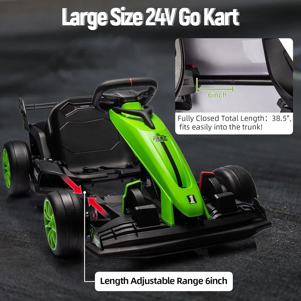 Safety for Kids -- The go kart equipped with slow start function to absorb shock when starting the car and the seat belt keeps your kid secure while driving. Depress the pedal to accelerate, release the pedal to decelerate and brake, easy operation for children 7.5mph High Speed --Two 200W large motors 25000rpm provided powerful motion to the car , infinitely variable speed provides very cool driving experience to your kids, racing circling and drifting stability.24V 7Ah battery provide more playing time for kids ,suitable for 6+ years as birthday Christmas Gift . Go Kart Design -- Extra Large size of the car and 14.3" seat wide provide very spacious and comfortable driving experience, most kids or teenagers can drive it easily,max load reach to 135 lbs (60KG) . TPR front tires + Rear Nylon tires will suitable for high speed drifting. Excellent Gift -- The car overall size :49.61" L x 28.74" W x 21.26" H. The body has 6"(15cm) of length adjustment space, Under the minimum length, the toy car can be easily put into the trunk of an ordinary car, easy to carry on outings and games. Comfortable Driving Experience -- This is a car that can be played with from childhood to adulthood. The seat width of this car is more than 14 inches, which is very spacious even for children over 1.6 meters tall, plus the adjustable car body length suitable for children of different ages and leg lengths. There is no need to worry about the seat being small and the legs not being able to stretch.