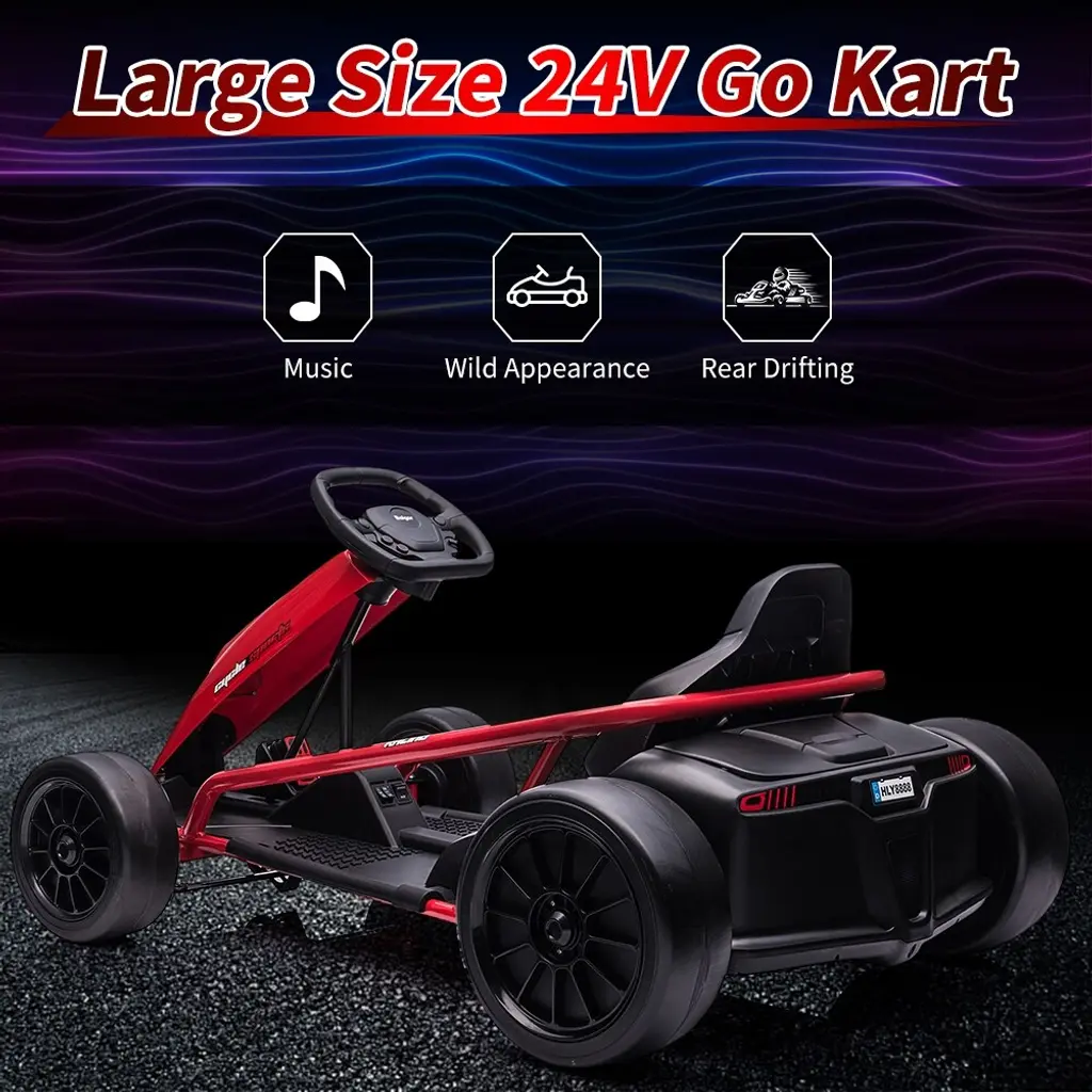 Kids 24V Electric Go Kart, Outdoor Race Go Karting Car for KidsPowered by 2 rechargeable 12V batteries that let your child enjoy the fun of riding.Equipped with 24V motor, it has a thrilling 8 mph max speed to make kids just like real racer.Push one button start, choose the forward/reverse gear, press the foot pedal, turn the steering wheel to give your kids the feeling of driving a real car.Suitable for 8-12 Years Old Boys Girls, UnisexMaterial: PPColor: White, Blue, Green, Red, Rose RedBattery: 24V(2x12V), 9AhMax Speed: 8mphWeight Capacity: 155lb(70kg)Size: 43.34"Lx30.34"Wx21.18"H🏎Powerful 24V Electric Drift Go-Kart: Featuring a cool design that mimics real go-karts, this electric go-kart provides your child with an authentic driving experience. Powered by 2x12V rechargeable batteries and a robust 35W motor, it can reach speeds of up to 8 mph.🏎Multi-Functional Electric Go-Kart: With a simple push-button start, this go-kart is easy to operate. It includes a music function, adding extra fun for kids and making them feel like real race car drivers.🏎Safety First: Equipped with a 5-point adjustable safety harness, this electric go-kart prioritizes children's safety for a worry-free ride.🏎Children/Adult Racing Drift Go-Kart: Built with a sturdy steel frame, this go-kart can support a weight of up to 155 lbs (70 kg), making it suitable for both children and even adults. Additionally, special drift wheels offer excellent durability and traction.🏎Great Gift for Boys and Girls: Your child can enjoy driving the electric go-kart in parks, playgrounds, or backyards. It’s the perfect birthday, Christmas, or New Year’s gift for kids and their best friends.