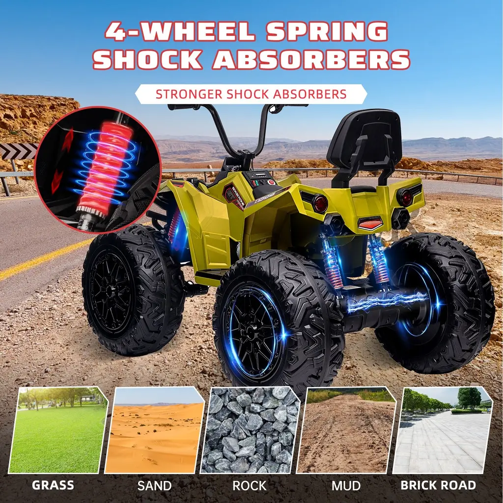 【400W Super Power】This ElectraSpeedy kids ATV is powered by 2x80W & 2x120W powerful motors and dual 12V 7AH rechargeable battery. Kids can enjoy up to 1-2 hours of a safe and thrilling ride, with a top speed of 5mph(High/Low Speed Switch: 1.8-5mph). Charging time: 8-12 hours. 【2 Seats for Endless Fun】The 18" long double seat can easily accommodate 2 kids at a time so that kids can share driving fun together. In addition, the 24v ride on is equipped with a backrest to enhance comfort and safety during the ride. ATV dimensions: 48.8"L X 30.7"W x 34.6"H. Load capacity: 110 pounds. Recommended age: for 3-8 years old. 【Kids-friendly Security Assurance】This 24v ride on toys features ASTM-certified anti-slip and explosion-resistant wheels, enabling smooth rides across various terrains. Thanks to a customized soft start and braking system, this kids four wheeler will smoothly start and brake to protect your children. The four shock-absorption suspension system further enhances your child's safety. 【Multiple Joyful Functions】This electric off-road all-terrain vehicle boasts stylish LED headlights, a simulated dashboard, and engine sounds that will captivate the eyes of children. Additionally, the 24v 4 wheeler integrates Bluetooth functionality, story playback features, a TF card slot, USB port, and a radio that can connect to portable devices, adding more fun to your child's driving experience. 【Perfect Gift for Kids】Driving this kids four wheeler, children can explore the outside world and satisfy their curiosity. They can also improve their hand-eye coordination. This atv for kids with rich functions is a great choice for a birthday or Christmas gift for kids.