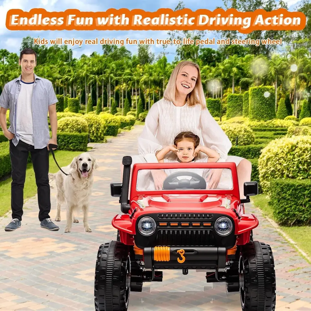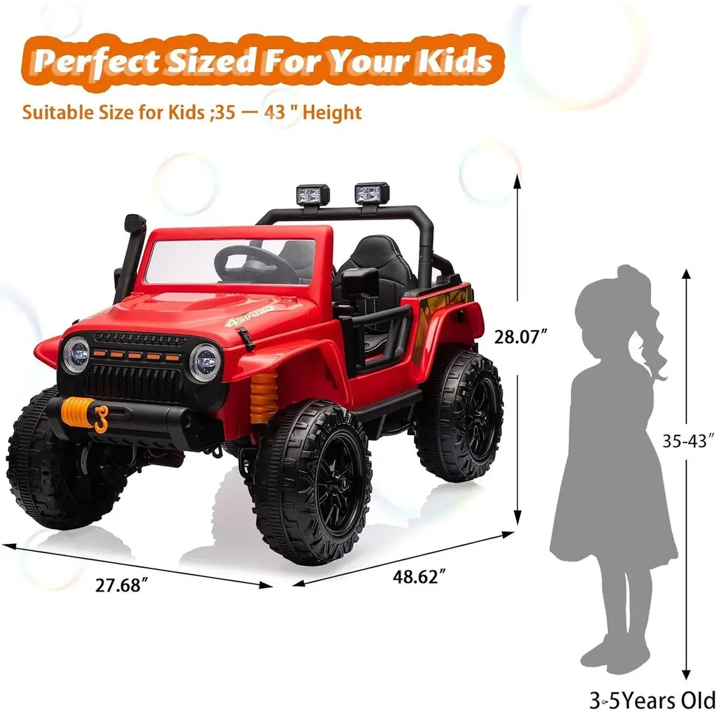 【4x55W Powerful Motors & 2-seater】Our truck is a powerful 24V two-seater car and the Max Load is 220 LBS. The large two-seater design can easily accommodate 2 kids under 4 years or only one older kid(3-8+ years) to drive. And we've upgraded to 4X55W powerful motors in our new model, which can provide stronger and more stable power to the car, complemented by a more durable battery to reduce failures and ensure an optimal performance. 【Two Driving Modes & Riding Fun】 Parental remote control & Kids manual operate. Kids will have fun with all family members. Adults can use 2.4Ghz remote control if kids are too young. Kids can drive alone by electric foot pedal and steering wheel. Also having various interesting functions can greatly increase the fun of driving. 【Soft Braking & Easy-Drag 4WD】The customized soft braking system ensures driving safety and virtually no impact on the driver during braking. When you release the remote control forward/backward button or the foot pedal, the car will stop smoothly within 1S. Easy-Drag technology achieves automatic power off of the front wheel motor when the car is turned off. The front-wheel has no resistance and can easily be towed away with the handle. 【Safety Performance】 The four large wheels with rear suspensions can adapt to any common pavement. Adjustable seat belts and safety door locks also keep the kids safe. And each motor is equipped with an independent overload protector, which effectively prevents burnout due to motor jamming. Besides, the "P" on the remote control is the emergency brake button, it can make the car stop immediately while emergency. 【SPECIFICATIONS】Overall size: 48.62"*27.68"*28.07"(L x W x H). Maximum Load: 220LBS. Speed: 2-4 MPH(3-7KM/H). Motor: 24V/ 4X55W. Playtime: 1~2 Hours(Fluctuates according to factors like load, speed, road surface & temperature). Other Functions: Wireless music player, powerful truck lights and real car engine sound.