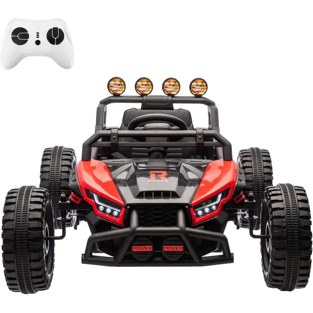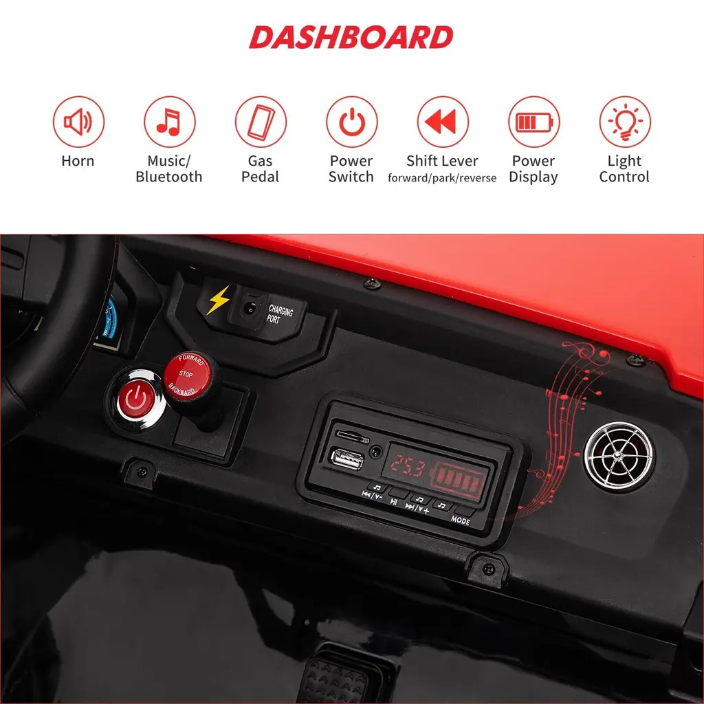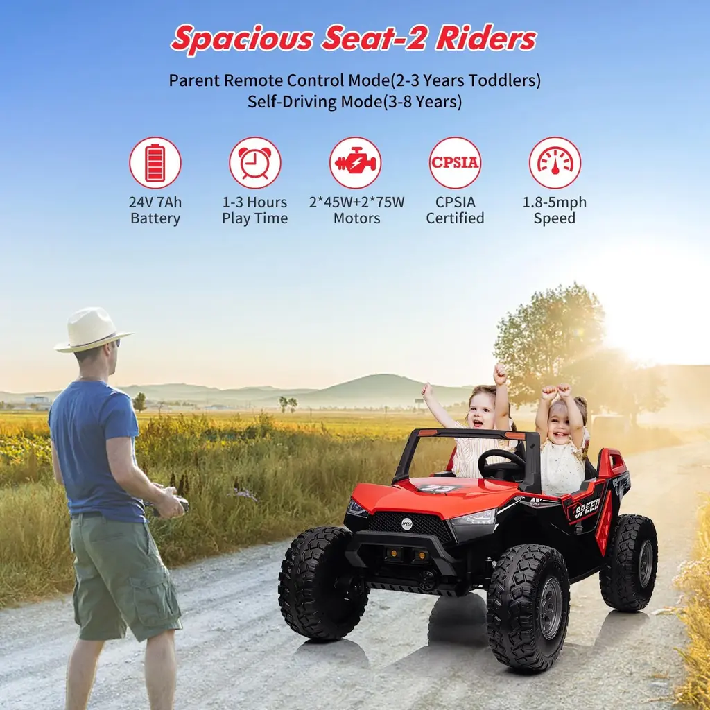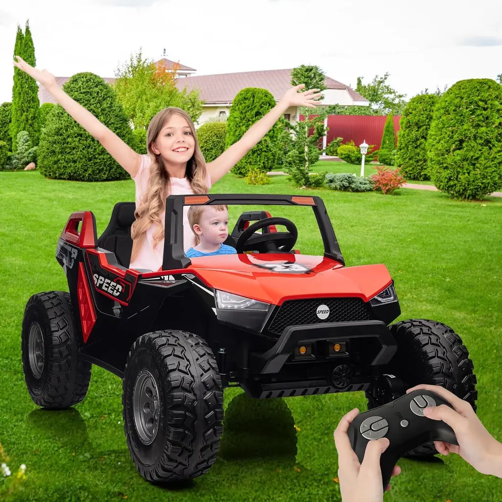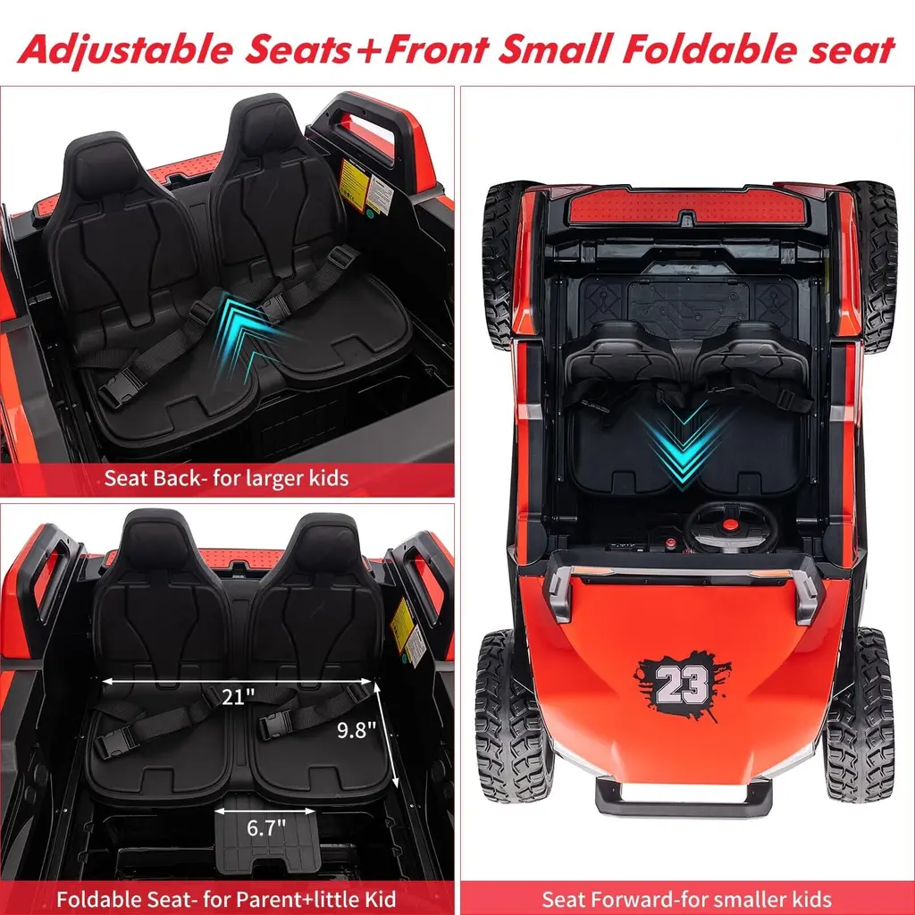 Dual Control System -- This 2-seater electric car offers both manual and remote control options. Children can operate the car independently using the foot pedal and steering wheel, while parents have the option to take control using the remote, which includes an emergency brake feature for added safety. Enhanced Driving Entertainment -- A car is big enough that can be played with from childhood to teenthood. The kids' car features a versatile music panel that supports USB, TF card, and AUX port connectivity for audio devices, allowing children to enjoy their favorite music while driving. Innovative 2+1 Adjustable Seating -- With a 21" seat length, this electric car can accommodate two children. The seats are adjustable front and back to cater to children of different ages. A foldable small stool is located under the large seat for older children to use when driving with a younger companion or during driving lessons with parents, promoting interactive play. Advanced Safety Features -- Certified by CPSIA, this kids' ride-on UTV ensures safety with a slow start function, parent remote control, adjustable seats with belts, 15.4" large EVA shock-absorbing tires, and metal spring suspension to prevent accidents and enhance safety. The seat adjustment feature accommodates variations in child leg lengths. Ultimate Kid's Gift -- Dimensions: 57.5" L x 38.6" W x 30"H that exceed standard 2-seater car sizes, a maximum load capacity of 140 lbs, speeds ranging from 1.8 to 5mph, Two 12V 7Ah batteries for extended playtime, and powerful 2*45W+2*75W motors, this electric car makes an ideal gift for birthdays, holidays, Christmas, or New Year celebrations.