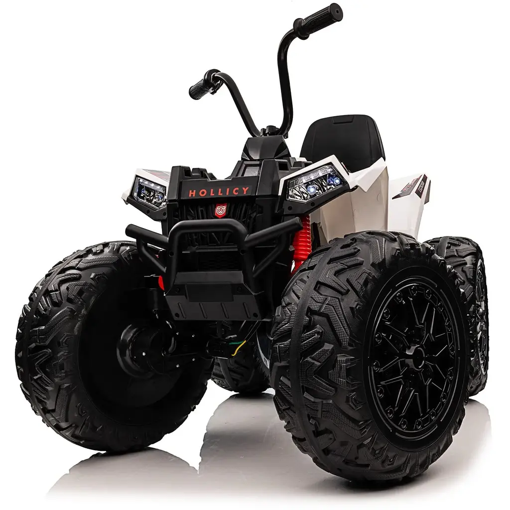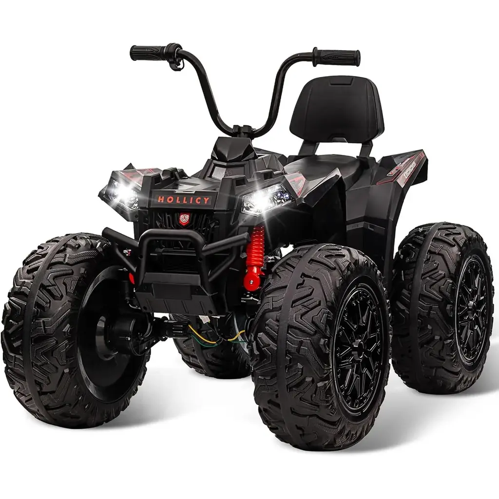 【Realistic Driving Experience】 ride on ATV equiped a accelerator handle and brake pedal to enjoy the real driving. Providing low & high speed modes, gives your kids the best experience. In addition, the customized soft braking system ensure the driving safety and virtually no impact on the driver during emergency braking. 【24V Powerful Motor & Large Battery】This kids 4-Wheeler is equipped with the 24V 2x80W & 2x120W strongest motor which can provide more constant & stable power in any conditions. The 7AHx2 large battery can provide 45-60 minutes driving duration under continuous extreme use. (66 LBS Load, Full Speed, Grass unflat surface & No stop). 【Excellent Safety Performance】a.The 24V kids electric vehicles is made of premium PP material and metal frame, the max weight capacity is 66lbs. b.Four spring suspension system and soft start technology of the kids car prevents children from being frightened by sudden acceleration or braking. c.Adjustable seat belts and backrest also keep the kids safe. 【Suitable for all Terrains】The 24v kids ATV features wear-resistant wheels,which made of superior materials with no possibility of leaking or tire burst, eliminating the hassle of inflating. EVA rubber tires make it easily to ride on all terrains, providing you good driving experience to your kids. Four 17.3'' large wheels provide the extreme stability. 【SPECIFICATIONS】Overall size: 48.8''x30.7''x34.6''(L x W x H). Wheel diameter: 17.3". Maximum Load: 66 LBS. Speed: 1.8-5 MPH(3-8 KM/H). Motor: 24V / Front 2x80W + Back 2x120W. Battery: 7AHx2 Play time: Around 1~3 Hours(Fluctuates according to factors like load, speed, road surface & temperature). Other Functions: Music Player, Bright Lights, Radio, Bluetooth/USB.