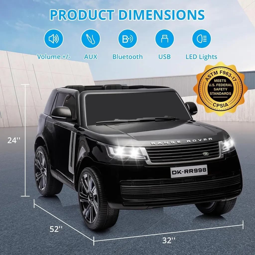 2-Seater Licensed Land Rover Truck: The 24V Kids Electric Ride On Car offers a spacious 2-seater design, resembling a licensed Land Rover truck. Children can enjoy an authentic driving experience while creating shared adventures with siblings or friends, enhancing social play and creativity. Advanced Bluetooth Connectivity: With Bluetooth compatibility for smartphones, this ride-on car allows kids to connect their devices and enjoy their favorite music or audio content while cruising. The connectivity feature adds a modern touch to the play experience, providing entertainment and personalization options for young drivers. Remote and Hand Control: The inclusion of a 2.4G Bluetooth remote control with slow start function and hand control options ensures parental supervision and safety during playtime. Parents can oversee and guide their children's driving, offering peace of mind and control over the vehicle's speed and movement. Enhanced Features and Multimedia: The ride-on car features LED lights for visibility, plastic wheels for durability, three ways key start for controlling lights, MP3 compatibility for music playback, electricity display for monitoring battery status, and USB connectivity for additional entertainment options. These features create an immersive and dynamic driving experience for kids.Powerful Performance: Equipped with a 12V7AH battery, two 35W motors, and available in green, black, red, and white color options, this electric ride-on car delivers exceptional power and performance. The combination of advanced features, high-quality components, and versatile color choices makes it a versatile and engaging choice for young drivers seeking a thrilling and interactive playtime experience.