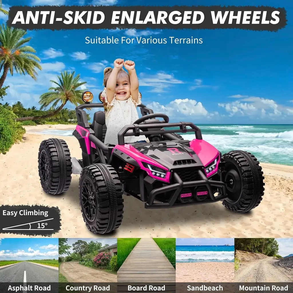 2WD Single Seat Kids UTV: The battery of this 24V kids UTV is a 24V battery. This kids UTV is designed for children aged 3+, 2*130W drive motors and EVA tire wheels can easily travel on different terrains.Versatile Design: This XXXL UTV ride-on vehicle has a cool body, equipped with LED lights, widened EVA wheels, MP3 player and fully opening and closing doors to increase the fun and authenticity of the driving experienceParent-child Mode: With a remote control for parent-child interaction, parents can use the 2.4G remote control to control the vehicle, including forward, backward, or steering. Children can drive the car by themselves, using the pedals to accelerate and the steering wheel to steer.Safe and Durable: This car is equipped with seat belts and four shock absorbers to keep your child safer during driving. It is made of durable materials that meet all child safety standards. CPSIA, CPC and ASTM-F963 certified. The car has undergone rigorous stability, choking, load and shear tests to ensure reliability and safety.Perfect Gift for Kids: Overall size: 45.7''x35.8''x24.3'', maximum load-bearing capacity of 66 pounds. The larger seat provides extra comfort for children over 3 years old. This ride-on UTV car is a perfect gift for kids and the best choice for various holiday gifts.