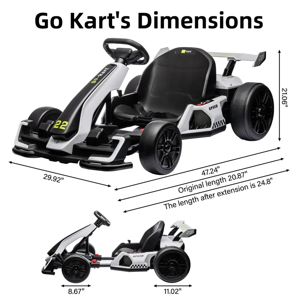 Powerful Performance & Speed:The 24V Kids Go Kart is equipped with a robust 300W motor powered by dual engines and a big battery, offering exhilarating speeds of up to 8 MPH. This powerful setup guarantees an outstanding drifting experience, all while keeping safety in mind, making it perfect for kids seeking adventure! Adjustable for Growing Kids:Designed with versatility in mind, this go-kart features a 3-level length adjustment system, allowing parents to easily adapt the kart to fit children of various heights. Whether your child is 6 or 12 years old, the adjustable seat ensures a comfortable and safe driving position for optimal control and enjoyment. Safety Features for Peace of Mind:Safety is paramount with the go-kart. It boasts a dual pedal system featuring a gas pedal and a separate brake pedal for immediate stopping ability. The sturdy plastic and steel construction, along with an adjustable seat belt and slow start function, provide added security so kids can ride with confidence. Entertainment on the Go Kart:This electric go-kart includes a multifunctional console equipped with a wireless music player, USB interface, and easy one-touch start. Children can enjoy their favorite tunes while driving, enhancing their ride with fun and excitement. Plus, the high/low speed and sports/drift mode options allow for tailored driving experiences! Perfect Gift for Young Adventurers:With overall dimensions of 47.2"L x 29.9"W x 21.06"H and a maximum load capacity of 110 lbs, this go-kart is the ideal birthday or Christmas gift for kids aged 6+ Enjoyable playtime lasting over 1 hour makes it a fantastic outdoor racing toy that encourages physical activity and provides endless fun!