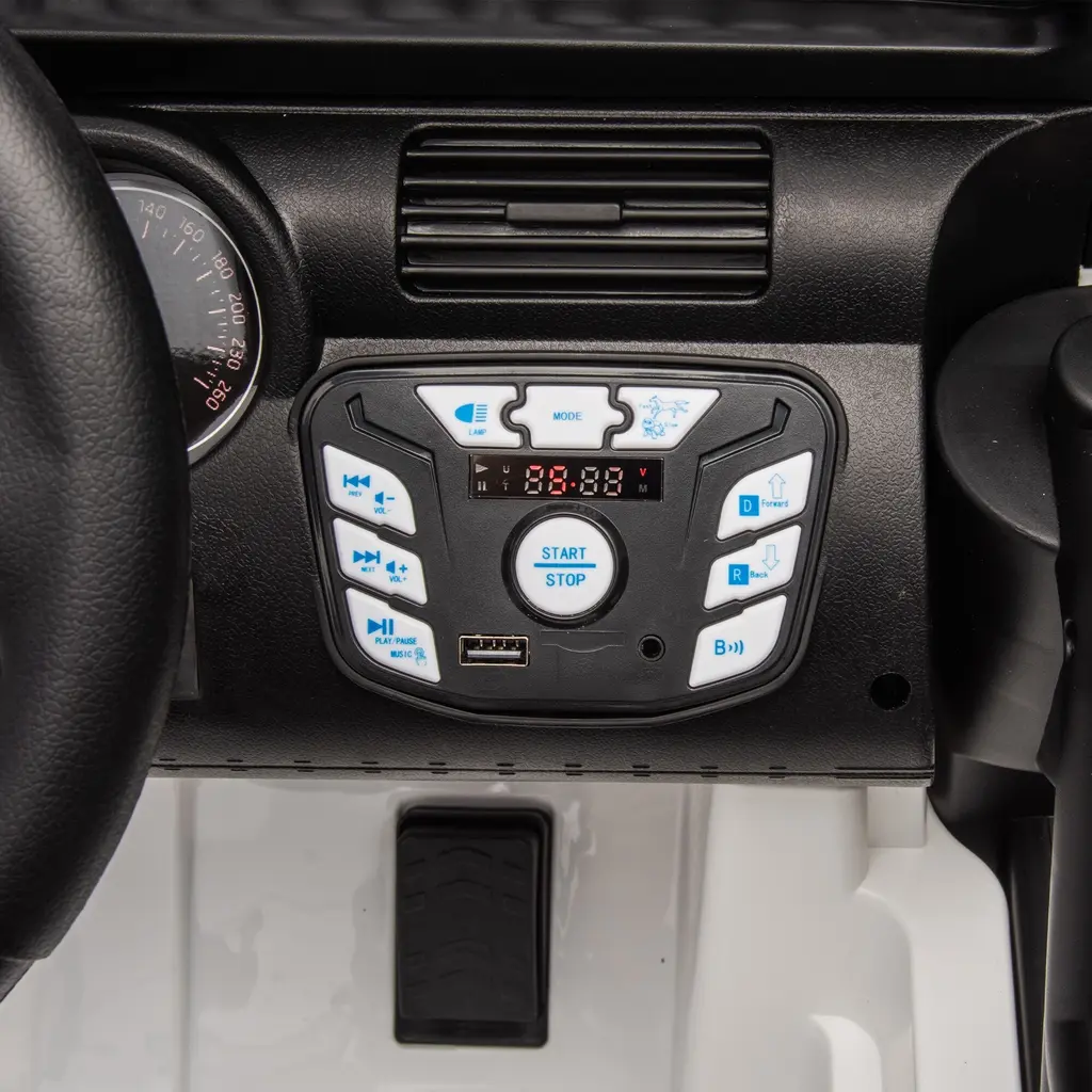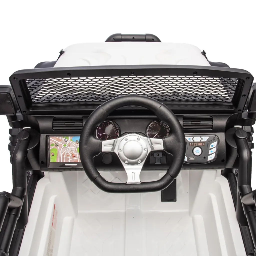 Product FeaturesDescription The power display function shows you the remaining power of the vehicle in an intuitive and clear way, so that you can plan the use time in advance and charge it in time to avoid the embarrassing situation of insufficient power when the child is playing thoroughly. The light switch control function gives the child control over the lights of the vehicle. Whether the headlights illuminate the road ahead or the rear taillights provide a bold warning when driving at night, the child is free to turn on or off as needed. The well-equipped four-wheel suspension system is the key to ensure a comfortable driving experience for children. When the children's car is running on the uneven road, this shock absorber system can effectively absorb and buffer the bumps, greatly reduce the body shaking, and provide children with a sense of stability. The configuration of four LED searchlights, including bright headlights and eye-visible rear lights, provides a double guarantee for the safety of the child carriage. The exquisite stickers presented with the toy car are an excellent gift to stimulate children's creativity and personality expression. This personalized decoration process not only allows children to play creatively, but also cultivates their aesthetic ability and self-expression ability BATTERY:24v7ah MOTOR:200w*2 Maximum Load:77.16 lbs Car speed:5-8km/h 3.11-4.97MPH Applicable age:3+ years old Test standards:CPC,ASTM,FCC FUNCTION:2.4G remote controlRemote control three speed adjustable, self driving two speed adjustable2*200W large motorFour LED searchlights (headlights and rear lights)Integrated central control (USB/ Bluetooth /MP3 interface/music/volume Adjustment/power display/one key start/light switch control)Four-wheel suspensionProviding 5-8km/h(approximately 3.11 to 4.97 mph) speed for kids over three years old to enjoy the fun of riding.
