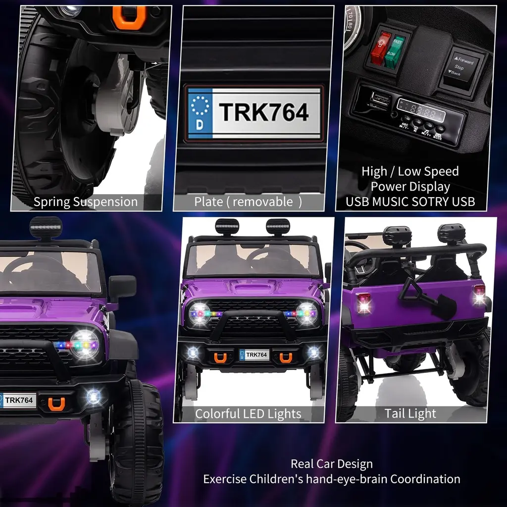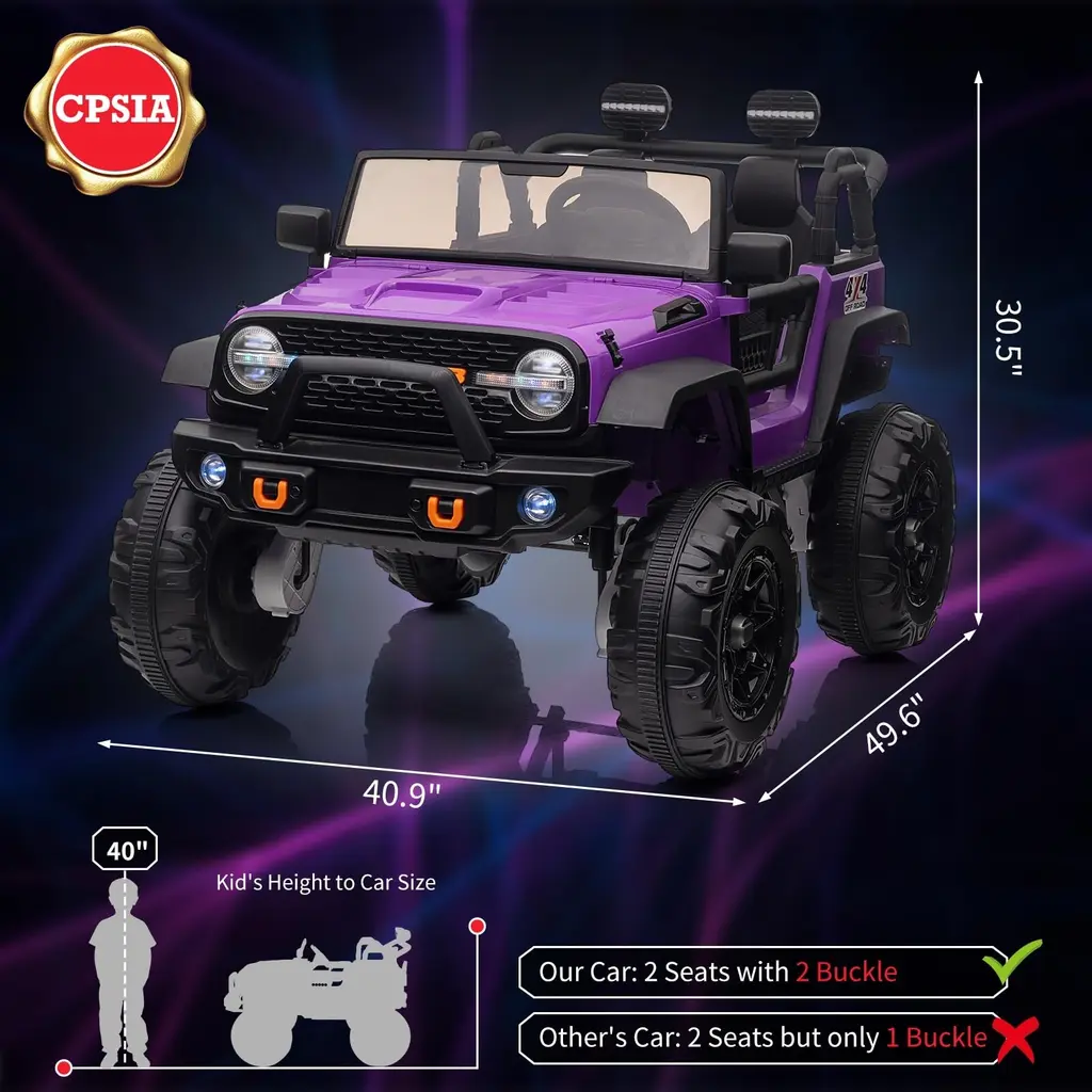 🚗Build-in Fun--The ride-on vehicle is already assembled with MP3, USB port, and bright LED Headlights+Taillight to provide much more fun for the child. The tail equipped with a shovel will bring more fun for kids. Play Time: 1.5-2.5 Hours after 8-12 hours charging.🚗Large 19.7" Seat Wide--Overall size: 47.6"*33"*32.3"(L x W x H). Seat Width: 19.7". Max Load:50KG(110LB). The large Two-Seat design can easily load 2 kids(under 4 years) or one 3-8 years kids to drive. 2 seats with 2 single safety belts for 1 or 2 Kids.🚗Manual & Parental Control: The parent can control the car by remote control to enjoy a happy time with the child. The child also can operate the foot pedal to control ideal speeds. Each wheel has an independent bearing to make steering smoother!🚗4WD Strong Motors: The ride-on truck equipped 24V 7A battery and 4*45W powerful motors, can better reflect off-road performance, adapt to various terrains, and provide continuous power in any condition! The slope of 20° can be easily passed.🚗Two Packages Delivered: Due to logistics restrictions, the ride-on car will be delivered in two packages! Please be patient to wait for both of them. After receiving the two boxes, please install the truck according to the installation video and user manual.