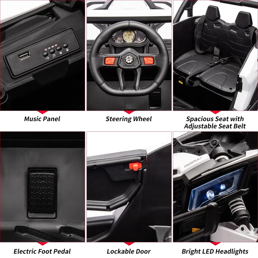 24V ride on UTV car, designed kids fun and adventure!Equipped with a powerful 24V 7AH battery and 200W motor, the adjustable speed settings of 1.9 to 4.9 miles per hour allow children to customize their driving experience based on their skill level and preferences.Featuring four off-road PP tires and advanced spring shock absorbers, smooth driving is ensured even on rough terrain.Colors Available: Red/White/Blue/Yellow/Rose/BlackSuitable Age: 37-95Months(3-8 Years Old), Boys Girls, UnisexLoad Capacity: 66lbsSpeed: 1.9-4.9mphSize: 40.9"Lx28.7"Wx24"HPower way: charging TypePackage includes:1 x Ride on UTV Car1 x Remote Control1 x Charger1 x User Manual