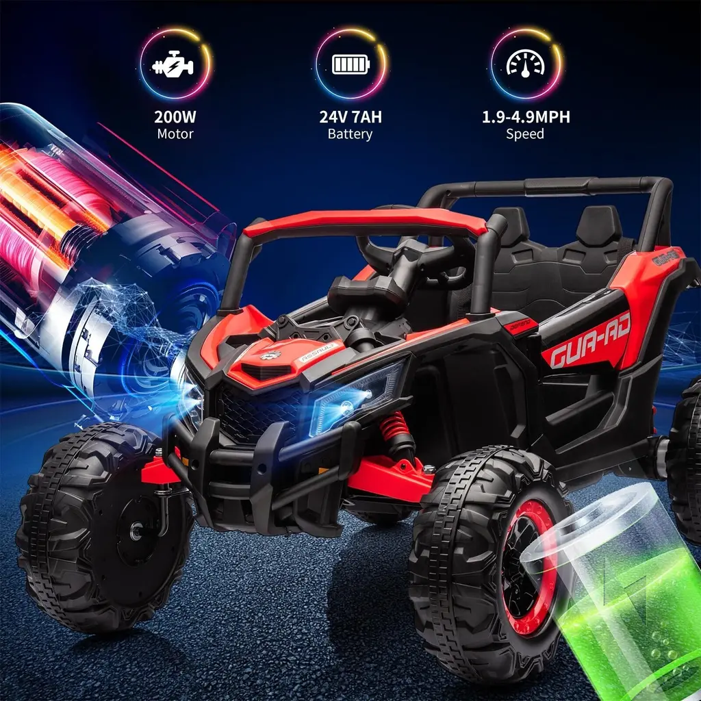 Sleek and Stylish Design:This ride-on UTV car boasts a modern, realistic appearance, complete with LED lights, durable EVA wheels, an MP3 player, and a flash drive port. Impressive Performance:Powered by a 24V 7AH rechargeable battery, this electric UTV is designed to navigate a variety of terrains, including grass, gravel, and gentle slopes. Flexible Driving Options:Children can enjoy the thrill of driving by using the foot pedal for acceleration and the steering wheel for navigation. Safe and Durable Construction:Built from high-quality materials that meet stringent child safety standards, this ride-on UTV has passed CPSIA, CPC, and ASTM-F963 certifications. Ideal Gift for Kids: It's the perfect gift for children, promoting their independence and coordination through exciting play experiences.