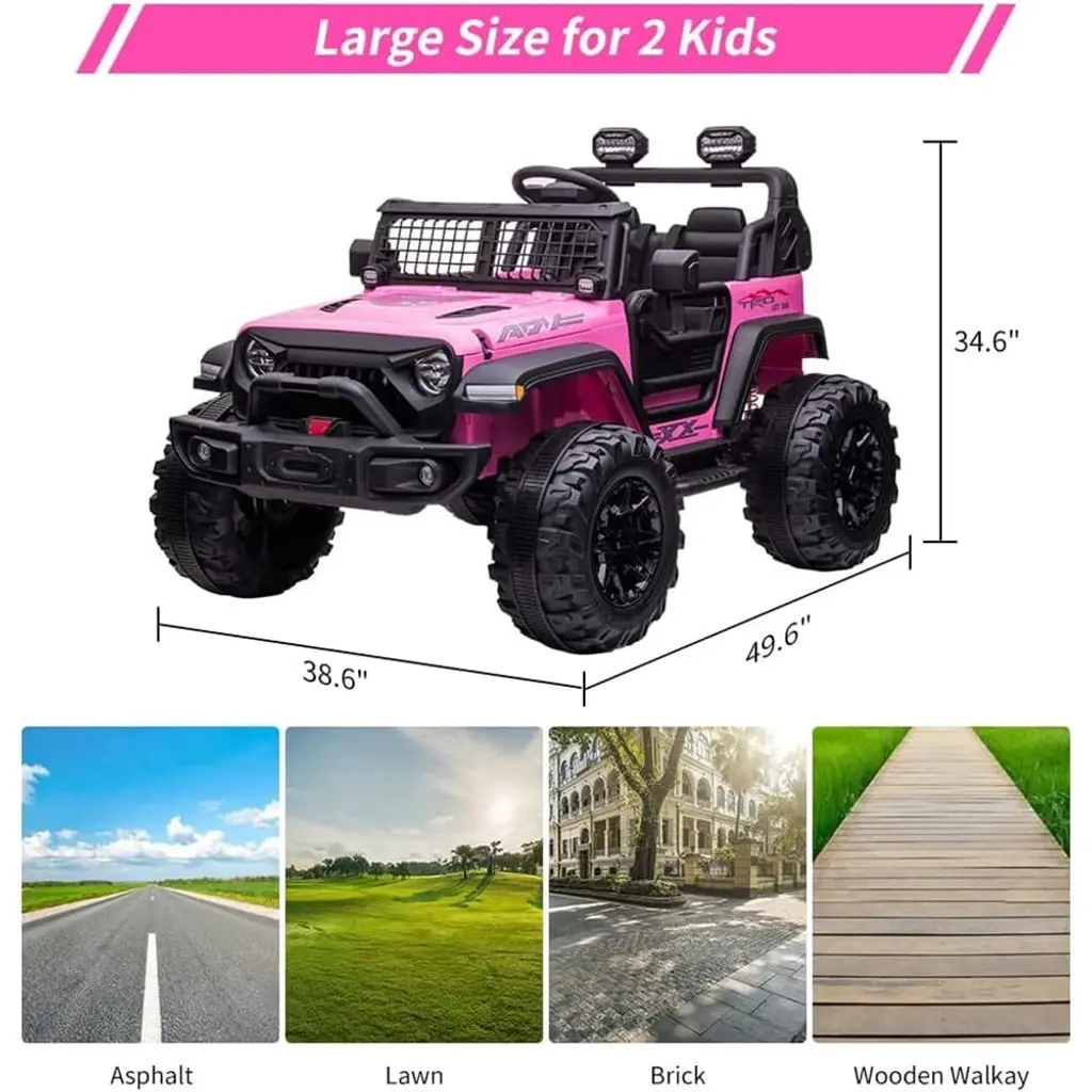 🚗Happy time for you and your kids! Best gift for children!🚗Crafted with durable construction, this 24V electric ride-on car can support 106 lbs. It is a great toy car that children can also feel the driving pleasure, and can enhance their strength, endurance, and coordination. A perfect gift for your little one, providing more outdoor fun for your child’s growth! Best gift for children! Build-in Fun--The ride-on vehicle is already assembled with MP3, USB port, FM radio, bright LED headlights, and Horn, Bluetooth, and Bottle Holder to provide much more funny for the child. The Front storage bin will allow your kids to take toys along with them. The large Two-Seat design can easily load 2 kids(under 4 years) or one 3-8 years kids to drive. 2 seats with 2 single safety belts for 1 or 2 Kids. Due to logistics restrictions, the truck is delivered in two packages! Please be patient to wait for both of them. After receiving the two boxes, please install the truck according to the installation video and user manual.Features:Manual & Parental ControlTwo Packages DeliveredKid-Friendly Details for OperationLarge 20" Seat Wide2x120W Strong MotorsMusic Functions for Joyful DrivingDimensions:38.6"W x 49.6"L x 34.6"H