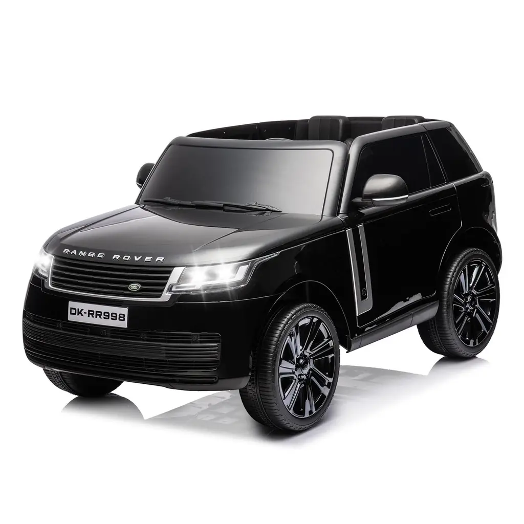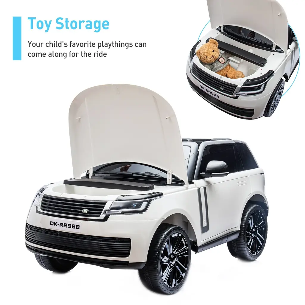 24V 2-Person Seating: This officially licensed 24V Land Rover ride-on features double seating, allowing your child to comfortably cruise with a friend or sibling, enhancing the fun of every adventure. Smooth Driving Experience: Equipped with 4-wheel suspension and treaded tires, this ride-on car provides a smooth and stable ride. Kids can choose between a low speed of 1.9 mph for safer cruising or a maximum speed of 5.0 mph for a thrilling experience. Manual and Remote Control Options: Children can drive the vehicle manually or use the 2.4GHz remote control for added safety and supervision. The remote offers forward/reverse controls and speed selection, allowing parents to guide their little ones as needed. AUX Player and Extra Features: Kids can connect their devices to the AUX input to enjoy their favorite music while driving. The ride-on also boasts working LED headlights, a horn, and realistic startup sounds for an immersive driving experience. Durable and Functional Design: Built from tough PP plastic and a sturdy metal frame, this ride-on is designed to withstand years of play. It features under-hood storage for small items and a rear handle for easy transportation when not in use. Overall dimensions are 52" (L) x 32" (W) x 24" (H).