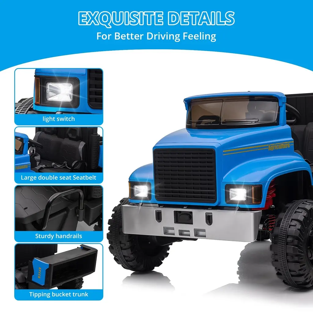 【2-Seater Ride On Car with Safe Belts】This kids electric car is designed Two seats with 2 separate seatbelts and plenty of seat room( width seat: 20inch), which easily allows 2 kids under 4 years to drive together or only one older kid(3-8+ years) to drive. And and the Max Load is 110 LBS. 【24V Powerful Battery & 4x200W Motors】This kids ride on truck is powered by an updated rechargeable battery and driven by 4pcs 555# motors and with EVA Tires, which provide you continuous and stable power to ride on different terrains. The range of speed: 1.86-4.97mph. 【Kids Driving Manually & Remote Control】There has two driving modes options: Your kids can enjoy driving through the gas pedal and steering wheel by themselves. Or the parents can use the 2.4G remote control to safely guide them when your kid learns to drive it. 【Joyful and Multifunctional Toy Car】The 24v ride on car features with the headlights/lightbar, horn sound, built-in music and an actual bluetooth stereo that allows you to play kids' favorite music or stories through the device connections. 【High Performance Driving Experience】Craft from non-toxic and harmless PP material Certified by ASTM F963 CPSIA. Easy to start, equipped with the rear Spring Suspension, Soft Braking, safety belts and double lockable doors which ensures your kids have a safe and comfortable driving trip.