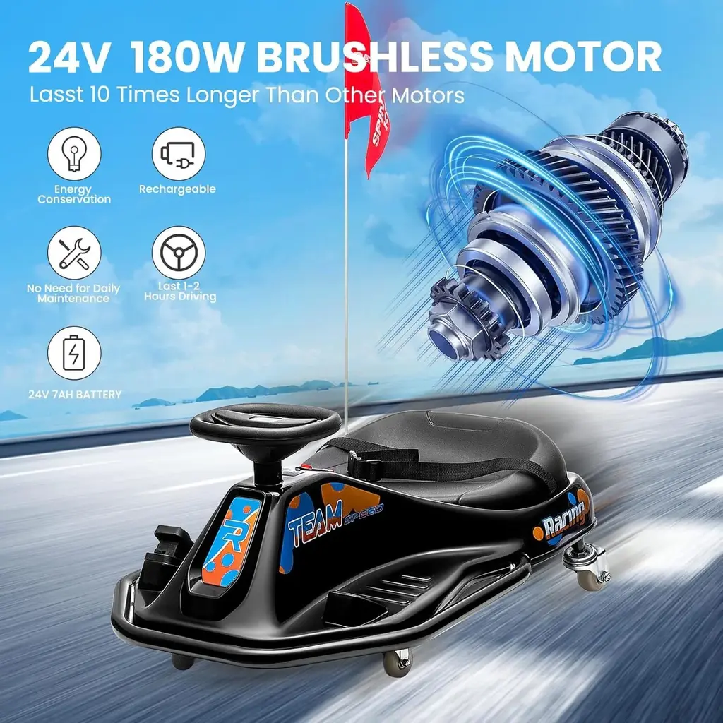 ??️ This electric go kart features a simplified drifting system, controlled with just the steering wheel and foot pedal, allowing you to experience the thrill of high-speed drifting in a unique and straightforward manner. ??️This drift kart boasts a 24V 180W brushless motor, which is not only powerful but also low-maintenance and incredibly long-lasting - at least 10 times longer than regular motors. It is equipped with a variable speed foot pedal, allowing kids to reach speeds between 1.9-5mph, making it perfect for little beginners and enthusiasts alike. ??️This 24v ride on toy comes equipped with music,USB, allowing kids to enjoy their favorite tunes. Furthermore, go kart for teens features dazzling lights, adding an extra layer of fun to the children's driving experience. ??️Safety first - This electric vehicle is designed with a low center for enhanced stability, ensuring a smooth and secure ride while preventing rollover. The seat with raised edges and safety belt prevent children from accidentally falling out. The gradual acceleration and deceleration function provides a gentle and safe start and stop for a worry-free ride. ??️24V7AH rechargeable battery for 1-2 hours of continuous riding after fully charged. Recommended age: 3-8 years old. ASTM and CPC certification, making it the perfect choice for a birthday gift or a Christmas present.