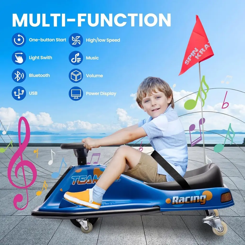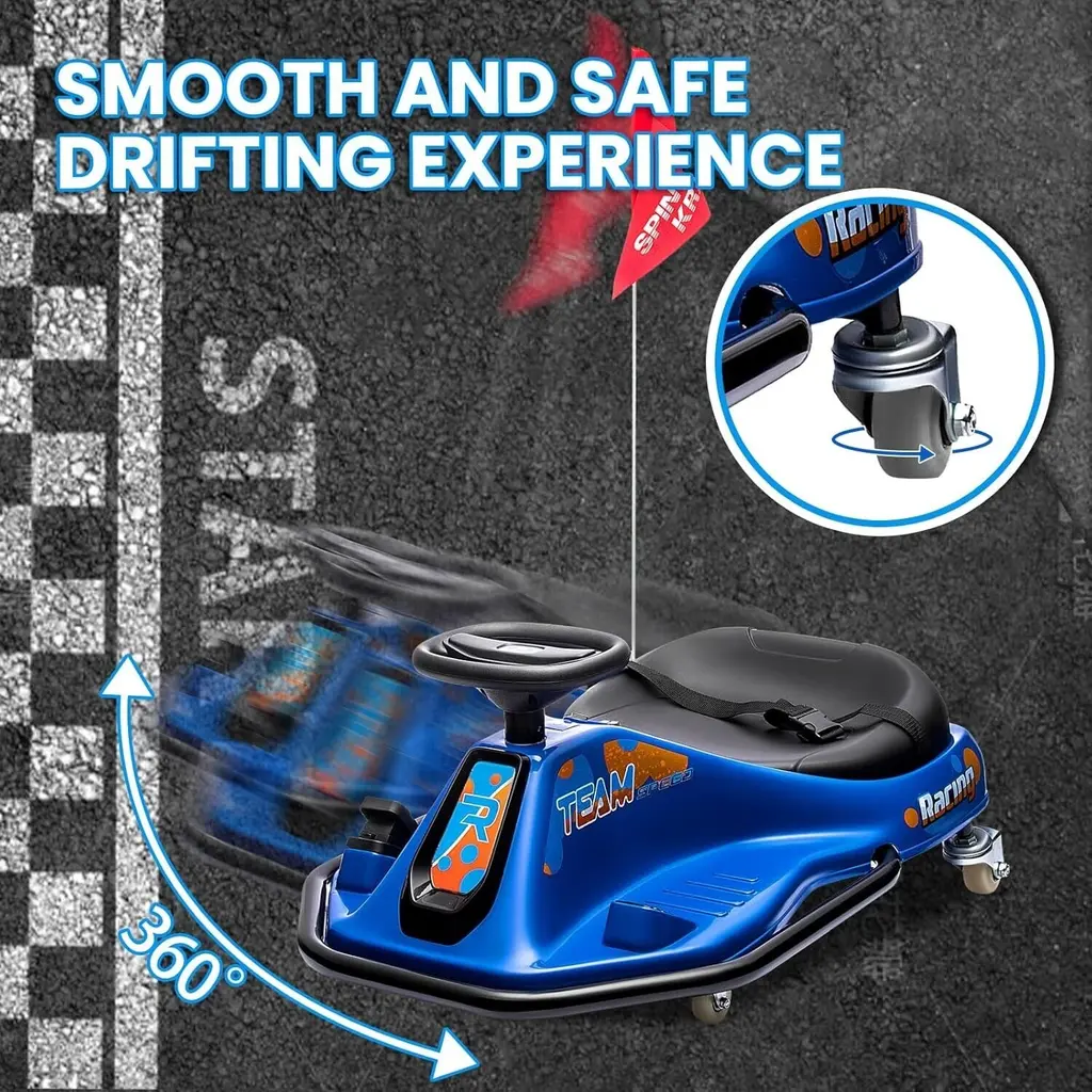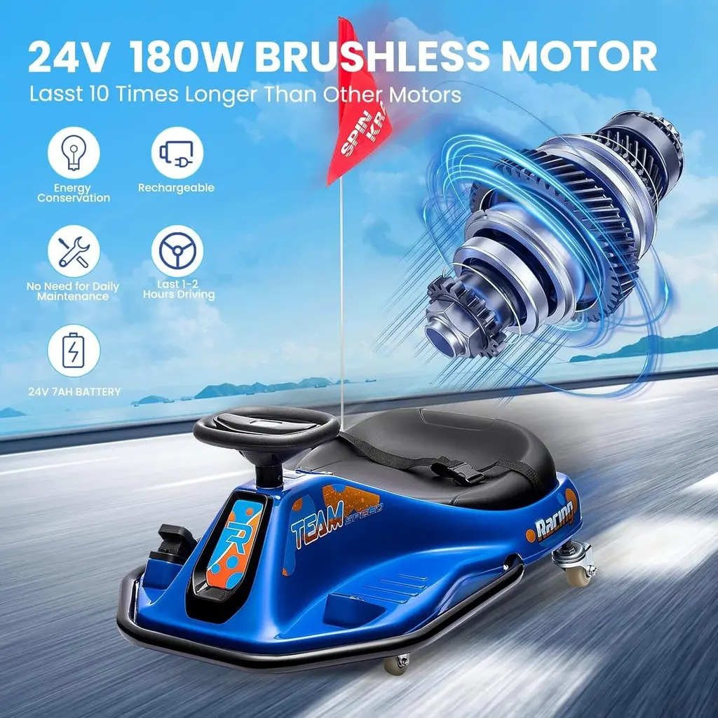 ??️ This electric go kart features a simplified drifting system, controlled with just the steering wheel and foot pedal, allowing you to experience the thrill of high-speed drifting in a unique and straightforward manner. ??️This drift kart boasts a 24V 180W brushless motor, which is not only powerful but also low-maintenance and incredibly long-lasting - at least 10 times longer than regular motors. It is equipped with a variable speed foot pedal, allowing kids to reach speeds between 1.9-5mph, making it perfect for little beginners and enthusiasts alike. ??️This 24v ride on toy comes equipped with music,USB, allowing kids to enjoy their favorite tunes. Furthermore, go kart for teens features dazzling lights, adding an extra layer of fun to the children's driving experience. ??️Safety first - This electric vehicle is designed with a low center for enhanced stability, ensuring a smooth and secure ride while preventing rollover. The seat with raised edges and safety belt prevent children from accidentally falling out. The gradual acceleration and deceleration function provides a gentle and safe start and stop for a worry-free ride. ??️24V7AH rechargeable battery for 1-2 hours of continuous riding after fully charged. Recommended age: 3-8 years old. ASTM and CPC certification, making it the perfect choice for a birthday gift or a Christmas present.