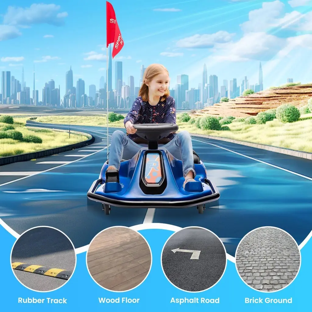 This electric go kart features a simplified drifting system, controlled with just the steering wheel and foot pedal, allowing you to experience the thrill of high-speed drifting in a unique and straightforward manner. This drift kart boasts a 24V 180W brushless motor, which is not only powerful but also low-maintenance and incredibly long-lasting - at least 10 times longer than regular motors. This 24v ride on toy comes equipped with music,USB, allowing kids to enjoy their favorite tunes. Furthermore, go kart for teens features dazzling lights, adding an extra layer of fun to the children's driving experience. Safety first - This electric vehicle is designed with a low center for enhanced stability, ensuring a smooth and secure ride while preventing rollover. The seat with raised edges and safety belt prevent children from accidentally falling out. 24V7AH rechargeable battery for 1-2 hours of continuous riding after fully charged. Recommended age: 3-8 years old. ASTM and CPC certification, making it the perfect choice for a birthday gift or a Christmas present.