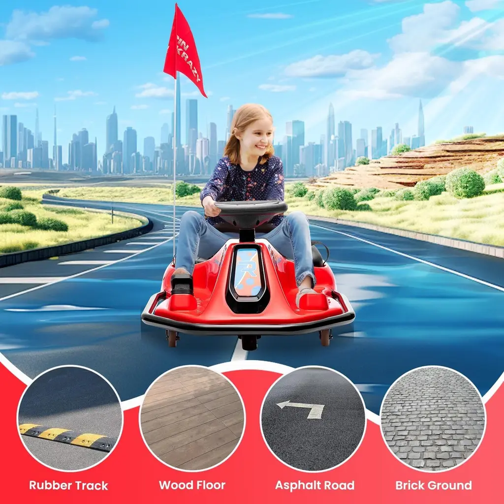 This electric go kart features a simplified drifting system, controlled with just the steering wheel and foot pedal, allowing you to experience the thrill of high-speed drifting in a unique and straightforward manner. This drift kart boasts a 24V 180W brushless motor, which is not only powerful but also low-maintenance and incredibly long-lasting - at least 10 times longer than regular motors. This 24v ride on toy comes equipped with music,USB, allowing kids to enjoy their favorite tunes. Furthermore, go kart for teens features dazzling lights, adding an extra layer of fun to the children's driving experience. Safety first - This electric vehicle is designed with a low center for enhanced stability, ensuring a smooth and secure ride while preventing rollover. The seat with raised edges and safety belt prevent children from accidentally falling out. 24V7AH rechargeable battery for 1-2 hours of continuous riding after fully charged. Recommended age: 3-8 years old. ASTM and CPC certification, making it the perfect choice for a birthday gift or a Christmas present.