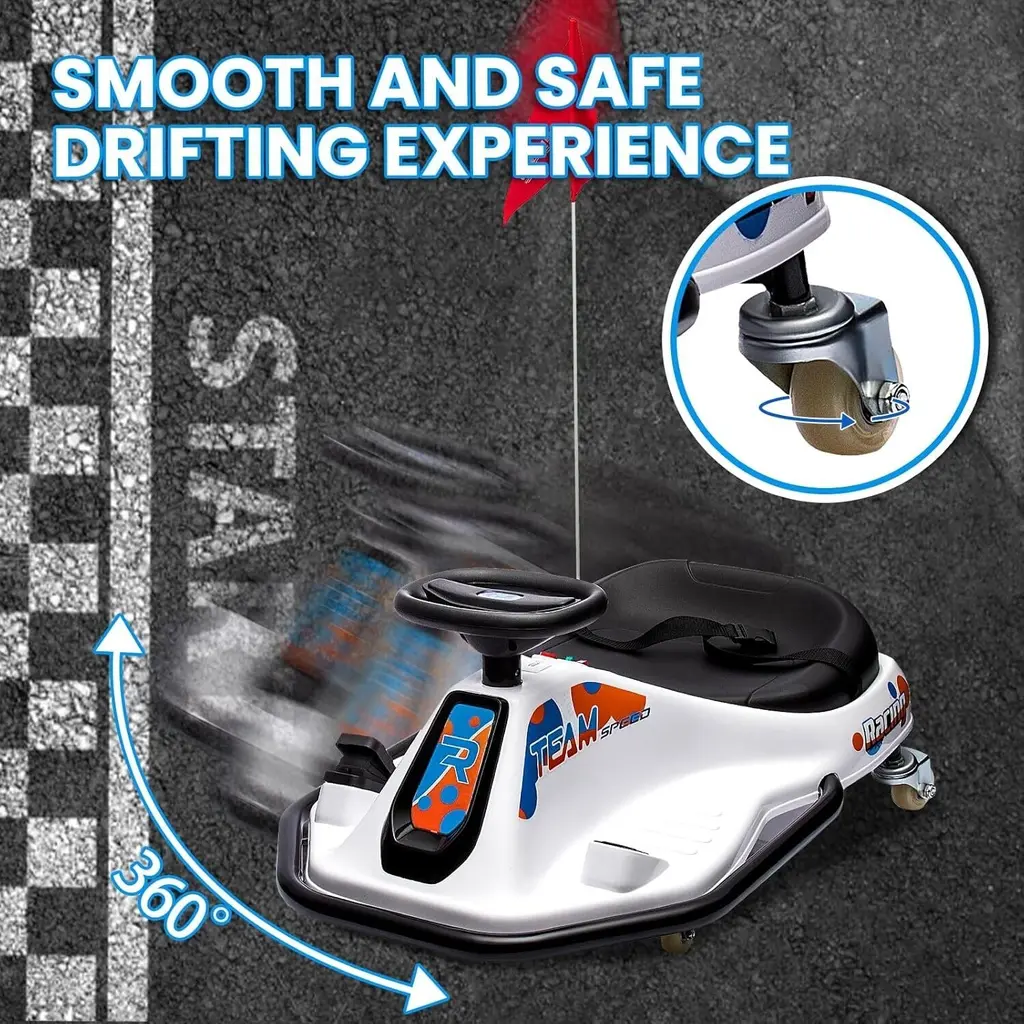 ??️ This electric go kart features a simplified drifting system, controlled with just the steering wheel and foot pedal, allowing you to experience the thrill of high-speed drifting in a unique and straightforward manner. ??️This drift kart boasts a 24V 180W brushless motor, which is not only powerful but also low-maintenance and incredibly long-lasting - at least 10 times longer than regular motors. It is equipped with a variable speed foot pedal, allowing kids to reach speeds between 1.9-5mph, making it perfect for little beginners and enthusiasts alike. ??️This 24v ride on toy comes equipped with music,USB, allowing kids to enjoy their favorite tunes. Furthermore, go kart for teens features dazzling lights, adding an extra layer of fun to the children's driving experience. ??️Safety first - This electric vehicle is designed with a low center for enhanced stability, ensuring a smooth and secure ride while preventing rollover. The seat with raised edges and safety belt prevent children from accidentally falling out. The gradual acceleration and deceleration function provides a gentle and safe start and stop for a worry-free ride. ??️24V7AH rechargeable battery for 1-2 hours of continuous riding after fully charged. Recommended age: 3-8 years old. ASTM and CPC certification, making it the perfect choice for a birthday gift or a Christmas present.