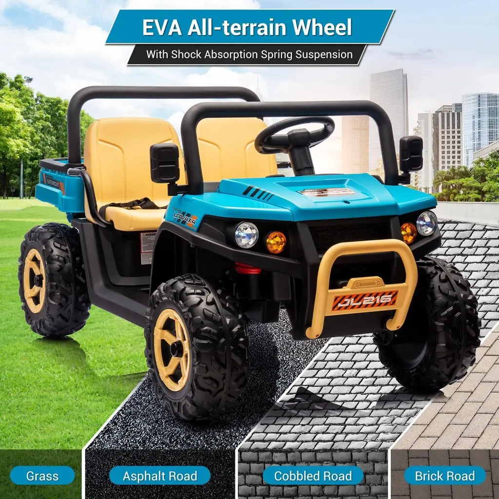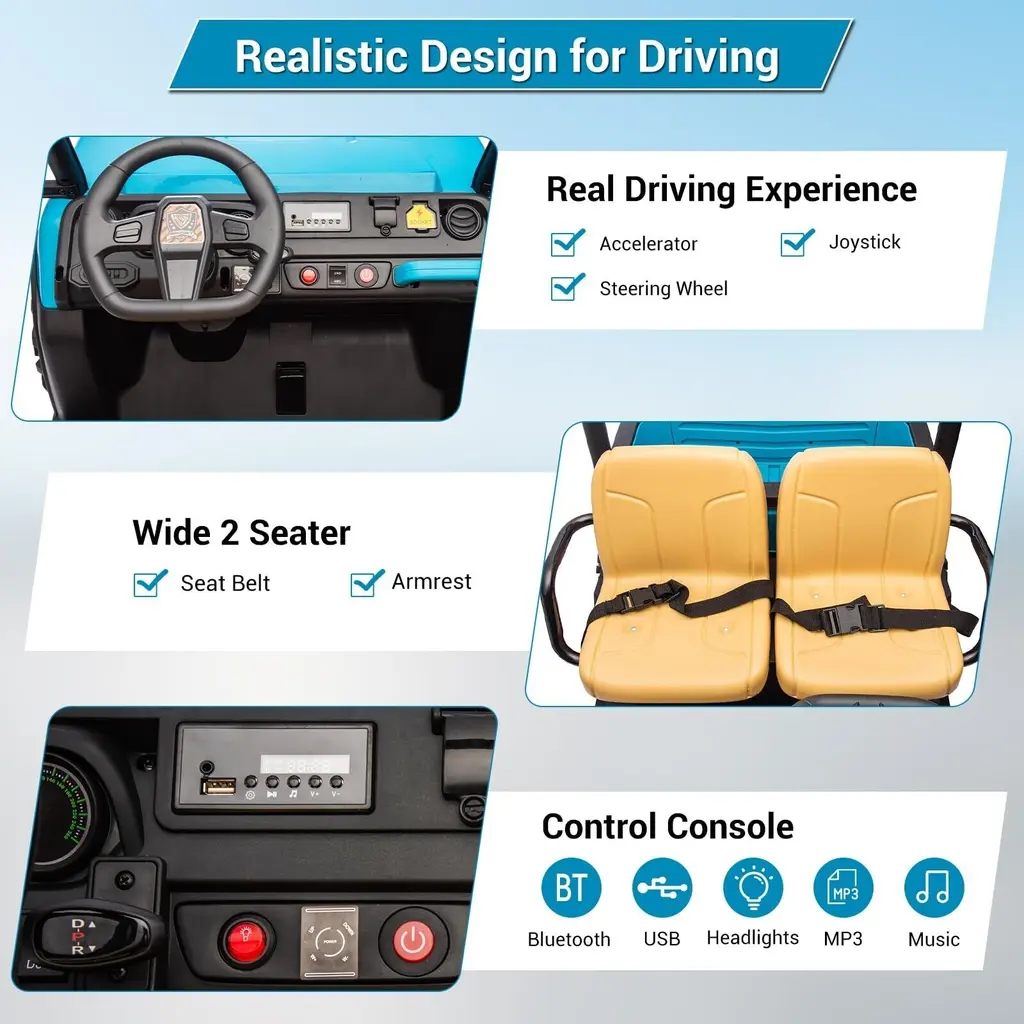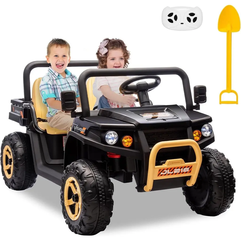 ๐๐๐ฅ๐๐๐ญ๐ซ๐ข๐ ๐๐ฎ๐ฆ๐ฉ ๐๐๐ & ๐๐ก๐จ๐ฏ๐๐ฅ: This kids 24 volt electric ride on toy with parental remote is equipped with an electric rear bucket, which can be automatically unloaded by pushing a button. With a plastic shovel, bluetooth, music player, and headlights, children can enjoy more fun. ๐๐-๐๐๐๐ญ๐๐ซ ๐๐๐ฌ๐ข๐ ๐ง: This kids' battery operated electric vehicle has two seats, which means that your child can share the fun with his siblings or friends. Each seat measures 8.66"D x 12"W. And the maximum load of this car is 77 pounds. Four-wheel spring suspension, seat belts, and the ubiquitous armrests keep your child safe. ๐๐๐จ๐ฐ๐๐ซ๐๐ฎ๐ฅ๐ฅ๐ฒ ๐๐ซ๐ข๐ฏ๐๐ง ๐๐ฒ ๐ ๐๐จ๐ญ๐จ๐ซ๐ฌ: Equipped with a 24V 7AH battery and four 35W motors, this kids ride on electric car with remote can achieve four-wheel drive, which makes the performance of the car more stable. The ride on electric car for kids side by side can reach a maximum speed of about 5mph and last 1-2h on a full charge. ๐๐๐๐ง๐ฎ๐๐ฅ ๐๐จ๐๐ & ๐๐๐ซ๐๐ง๐ญ ๐๐๐ฆ๐จ๐ญ๐ ๐๐จ๐ง๐ญ๐ซ๐จ๐ฅ: There are two ways to control this two seater drivable ride on cars for kids: children can drive the car manually; parents can also control the car through the remote. Choose the control method you like! ๐๐๐ซ๐๐๐ญ ๐๐ข๐๐ญ ๐ ๐จ๐ซ ๐๐ข๐๐ฌ: There is no doubt that this remote control kids ride on cars to drive will give children an authentic driving experience and endless fun to share. This is definitely a perfect gift for boys and girls. In addition, with an instruction manual and assembly videos, it is easy to assemble this kids electric UTV. Any questions, feel free to contact us.