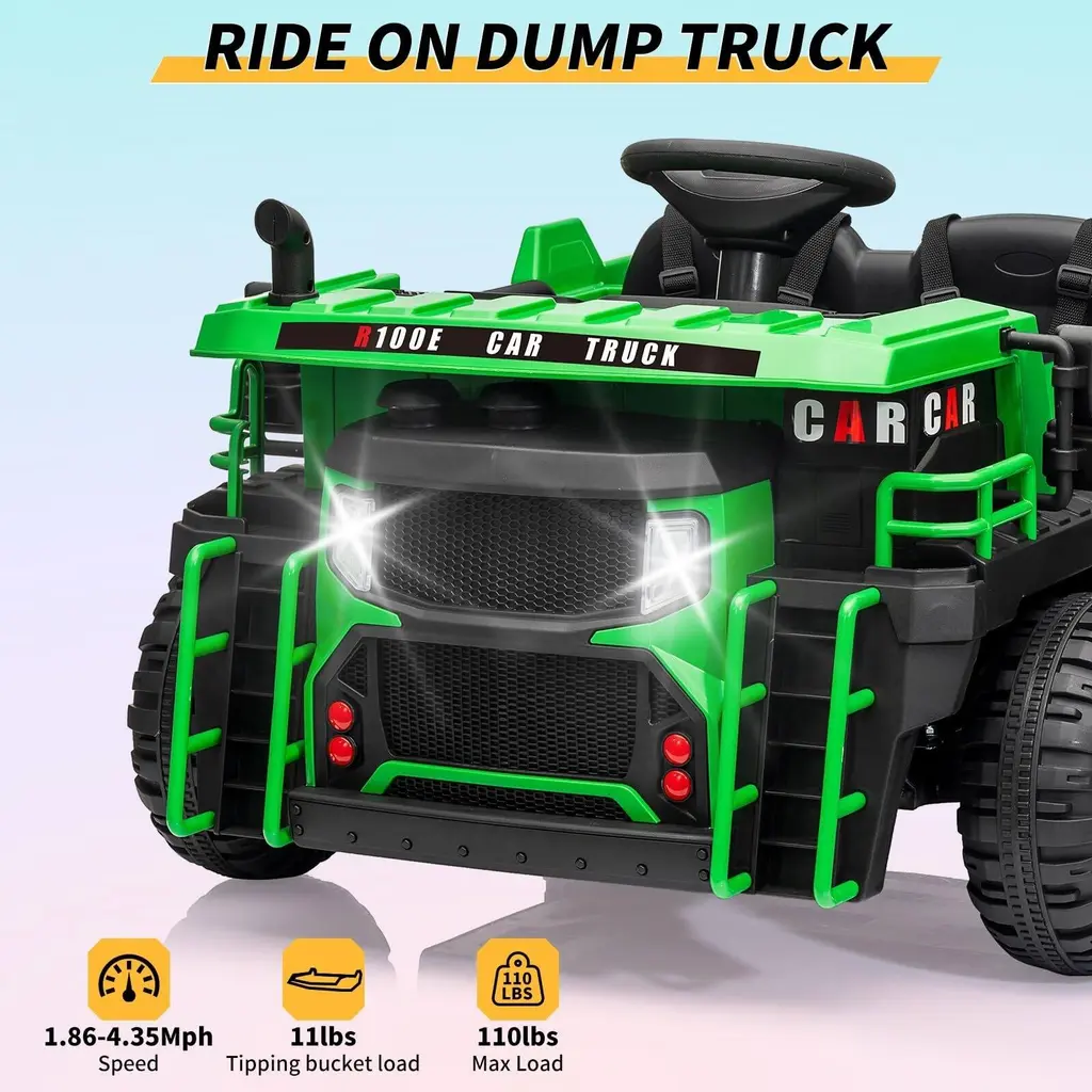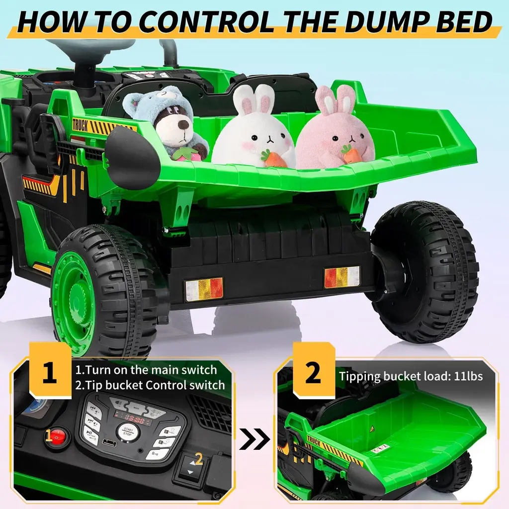 Versatile 2-Seater Design:This 24V ride-on dump truck features a spacious 2-seater configuration, allowing two children to enjoy adventures together. The comfortable seating promotes cooperative play, making it perfect for siblings or friends to experience the thrill of construction-themed fun side-by-side. Remote Control for Parental Guidance:Equipped with a user-friendly remote control, parents can oversee their child's driving experience, ensuring safety while allowing younger kids to explore. This feature provides peace of mind, enabling parents to in the fun while maintaining control over the vehicle's movements. Functional Electric Dump Bed and Extra Shovel:Designed for realistic play, this dump truck comes with an electric dump bed that allows kids to easily lift and unload materials. The included extra shovel adds to the interactive play experience, encouraging creativity and imaginative construction projects both indoors and outdoors. Selectable 2WD/4WD Options:This ride-on vehicle offers the flexibility of switching between 2WD and 4WD, allowing kids to tackle various terrains with confidence. Whether cruising on smooth surfaces or navigating rougher paths, this feature enhances the adventurous spirit of outdoor exploration. Exciting Features with Music Player and Speed Control:With a maximum speed of up to 4.35 mph, this ride-on truck provides a thrilling yet safe driving experience for kids. The built-in music player adds an entertaining element, allowing children to enjoy their favorite tunes while driving, making every adventure more enjoyable and engaging. Perfect for kids ready to dig into action!