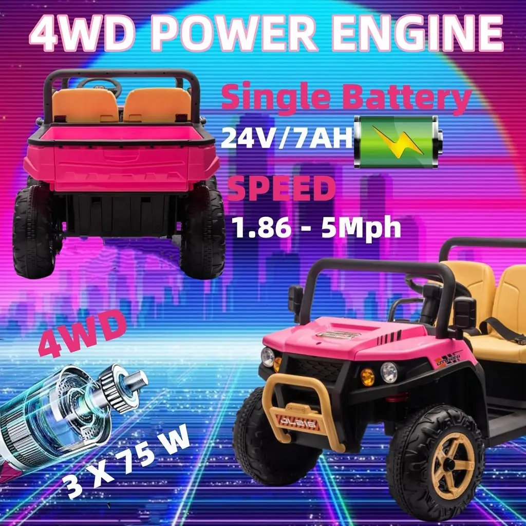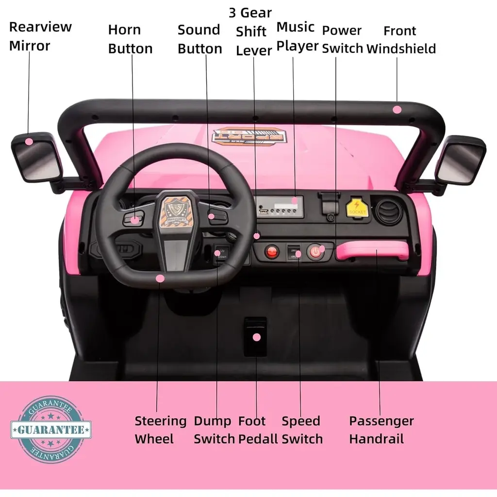 【Powerful Performance】: Equipped with a robust 24V battery and 4WD system, this Ride On Dump Truck for Kids conquers various terrains effortlessly, ensuring an adventurous ride every time 【Spacious Design】: Featuring a 2-seater configuration, this electric UTV allows your child to bring a friend along for the journey, enhancing their playtime experience with shared fun and excitement 【Interactive Features】: Comes with a functional dump bed and realistic controls, including 3 adjustable speeds, music, and headlights, creating an immersive and engaging driving experience for young adventurers 【Parental Control】: Includes a remote control for parents to supervise and ensure safety, providing peace of mind while your child explores, making it an ideal gift for special occasions like Christmas and birthdays 【Durable and Safe】: Constructed with sturdy 6-wheel design for stability and durability, this ride-on truck ensures a safe and enjoyable experience, perfect for kids who love outdoor play and adventure