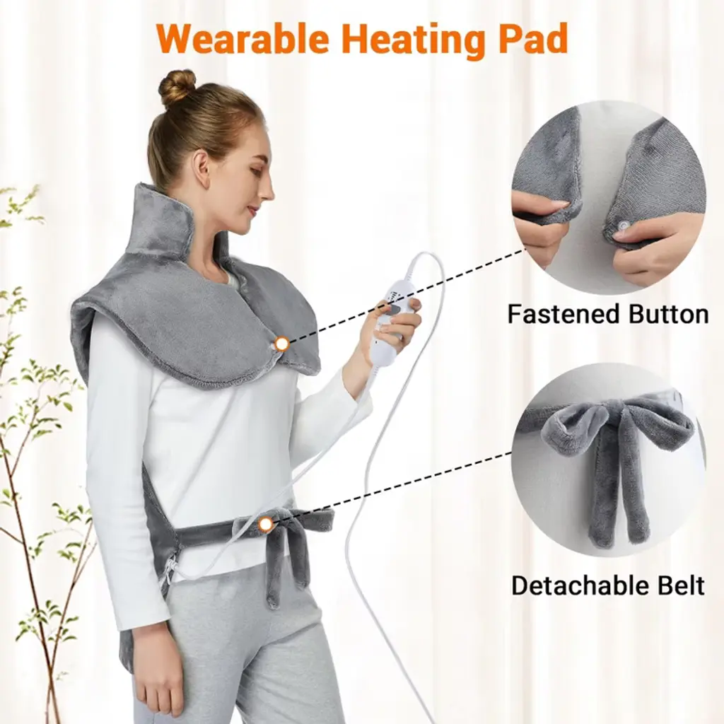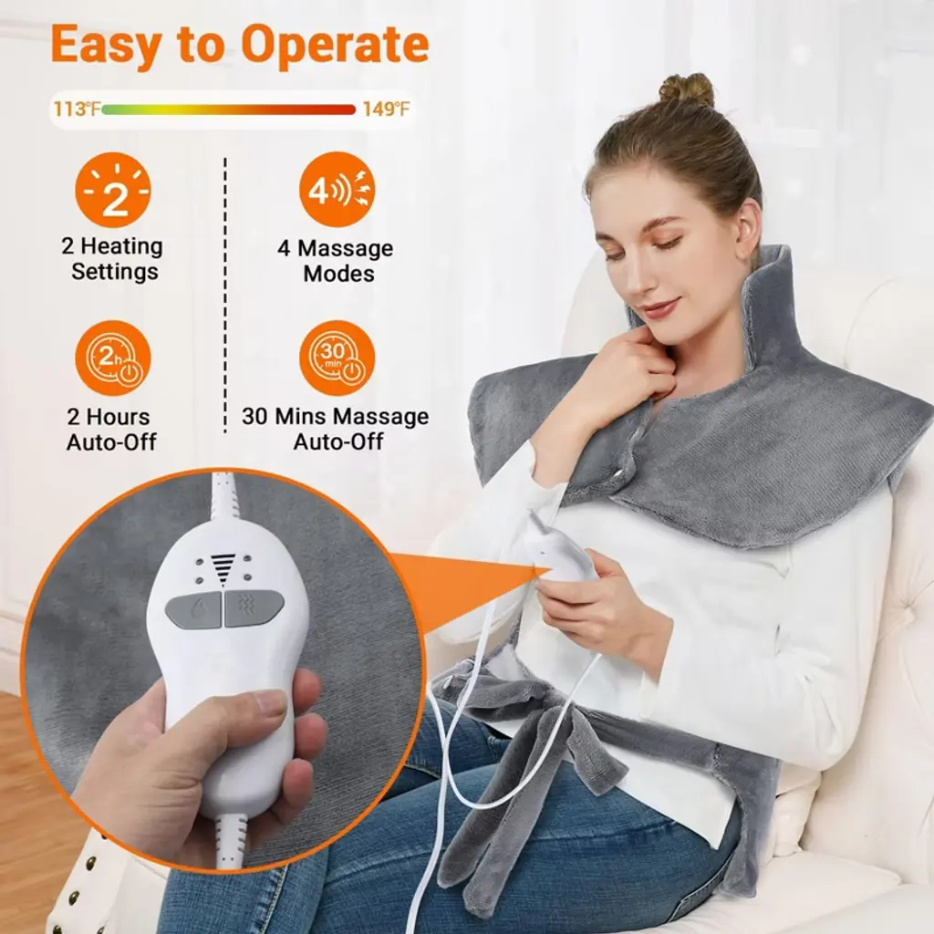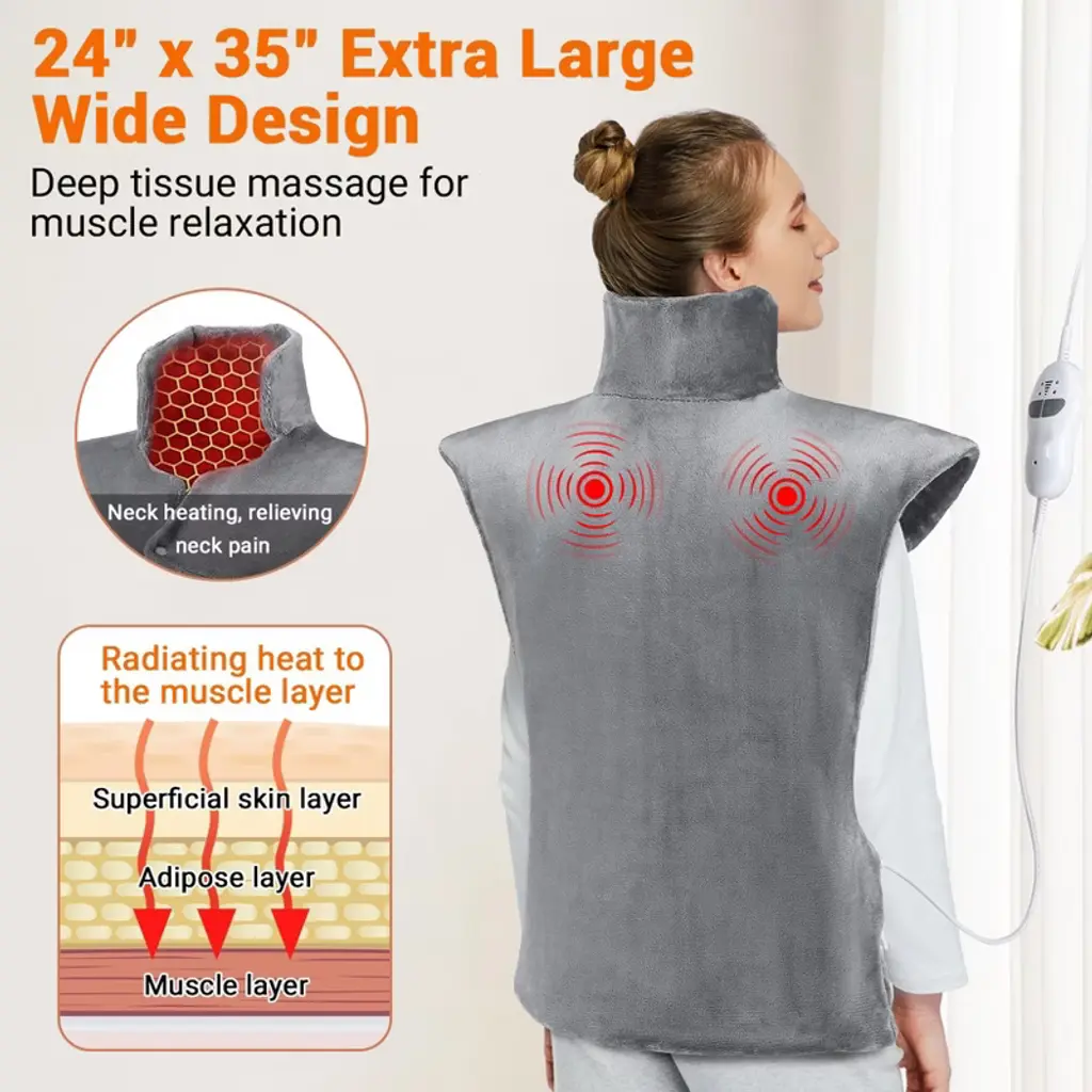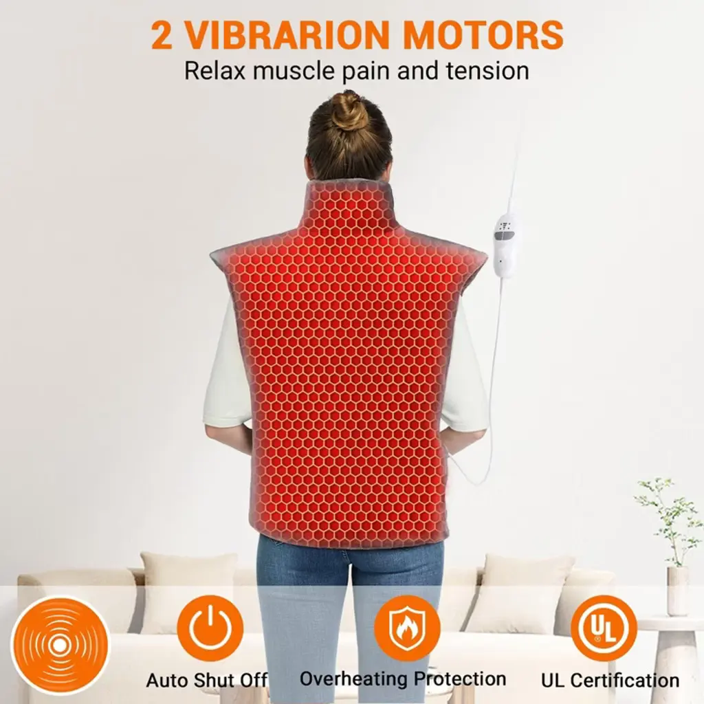 Experience full coverage relief with this extra-large electric heating pad, designed to contour your neck, shoulders, and back. Enjoy fast heating with three adjustable levels, built-in overheat protection, and relaxing vibration massage from two/four powerful motors. The hands-free, non-slip design ensures comfort and stability, while the ultra-soft velvet fabric provides a luxurious feel—making it an ideal gift for women seeking soothing warmth and relaxation.