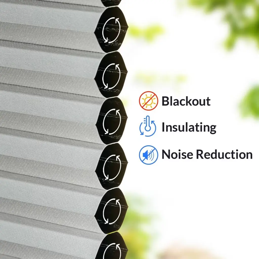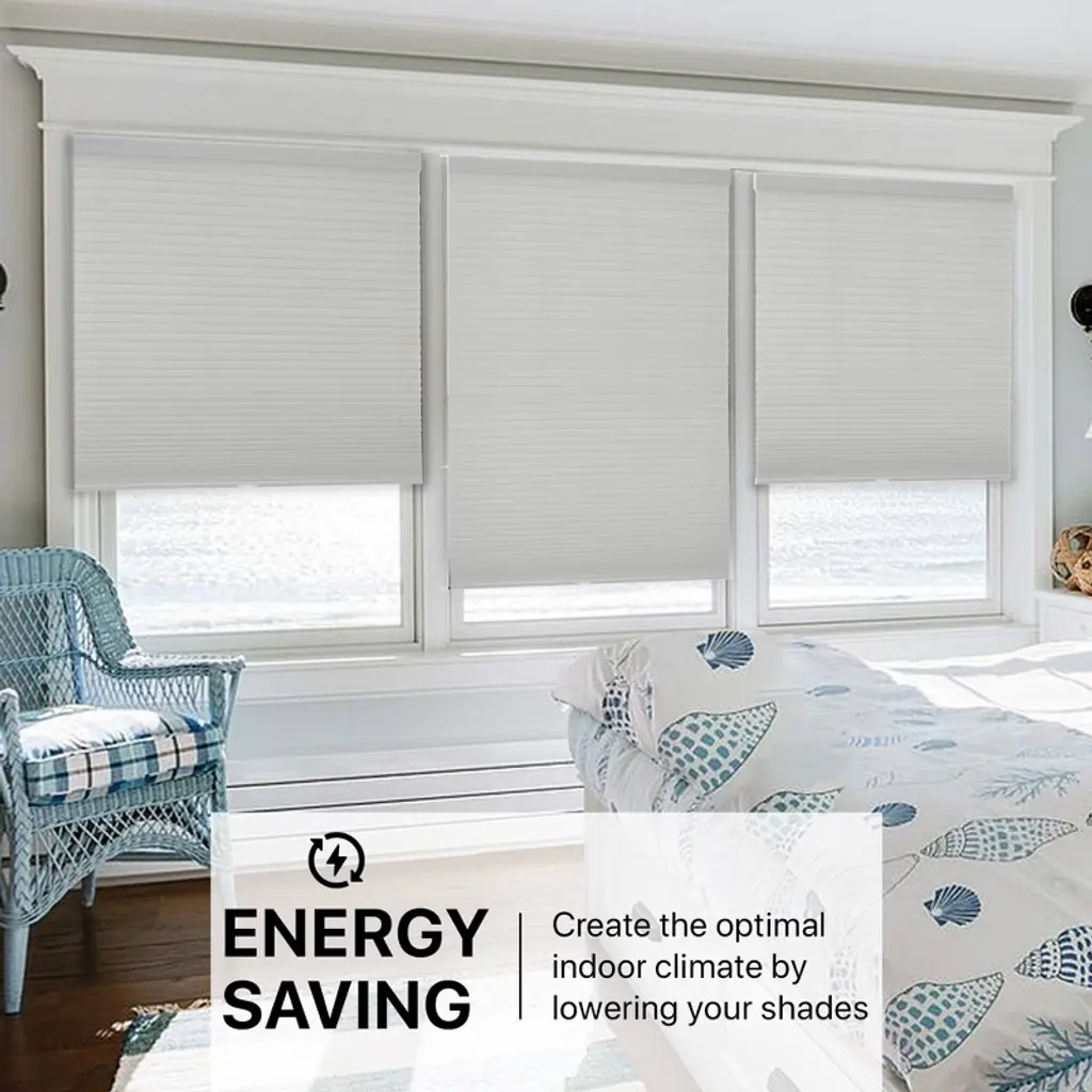Upgrade your space with our Cordless Blackout Cellular Shades, designed for total light control, privacy, and energy efficiency. The honeycomb structure insulates your home, keeping it cooler in summer and warmer in winter while also reducing outside noise. With a cordless, child-safe design, these shades offer smooth operation and a sleek, modern look that complements any décor. Ideal for bedrooms, nurseries, media rooms, and offices, they effectively block out sunlight, creating a restful and private environment. For a precise fit, they include a standard 1/8-inch deduction for inside-mount installation. Easy to install and maintain, these durable and stylish shades are a practical and elegant addition to any home.
