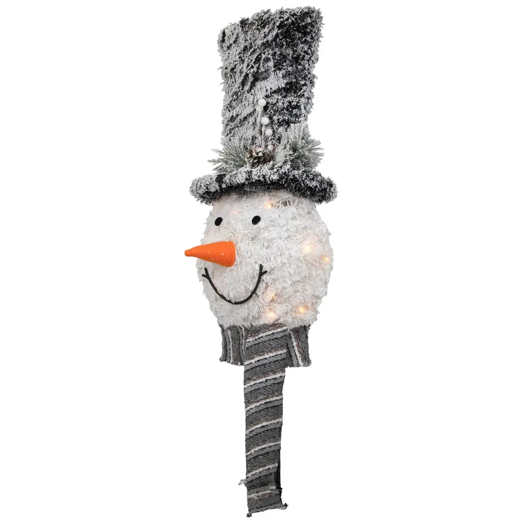 No Christmas is complete without a snowman, making this unique find a must-have this season. Decked out in a black frosted top hat and matching striped scarf, this tree topper is ready for the winter weather. Warm white lights offer the perfect amount of holiday glow. Product Features: Lighted snowman tree topper Pre-lit with 20 warm white lights Bulb size: mini Bulb type: incandescent 54" white lead cord Additional Features: UL-approved and certified for indoor use only If one bulb burns out, the rest will stay lit Comes with replacement bulbs and spare fuses Contains 1 plug with end connector which allows you to stack multiple lighted items together (not to exceed 210 watts) Wire gauge: 22 120 volts, 60 hertz, .08 amps, 9.6 watts Dimensions: 25"H x 12.5"W x 8"D Material(s): polyester/wire/plastic/metal