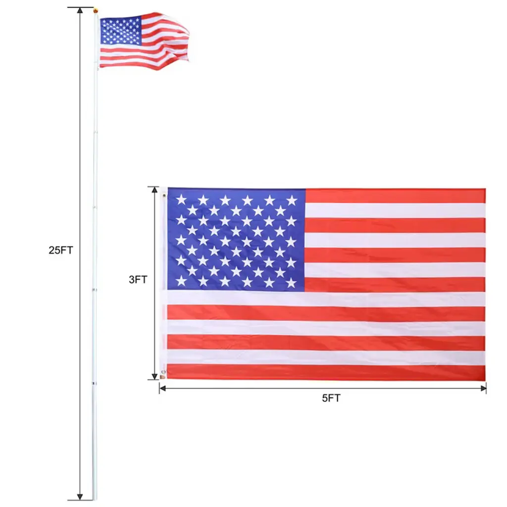Description: Product Name: 25Ft Telescopic Flag Pole Kit, Height Adjustable Heavy Duty Aluminum Flagpoles With American Flags & Top Ball, Outdoor In Ground Flagpole Color: Silver Material: Aluminium Installation and Storage: With its 5-section design, this aluminum flag pole allows for easy storage and quick assembly. And clear installation instructions are provided. Package: Your purchase includes a 3x5 American Flag, a gold ball ornament, 4 stainless steel clips, a heavy-duty PVC sleeve, and more. These inclusive replacements ensure that you can proudly display your flag with ease and convenience. Packing list: 1 set x 25Ft Telescopic Flag Pole Kit, Height Adjustable Heavy Duty Aluminum Flagpoles With American Flags & Top Ball, Outdoor In Ground Flagpole