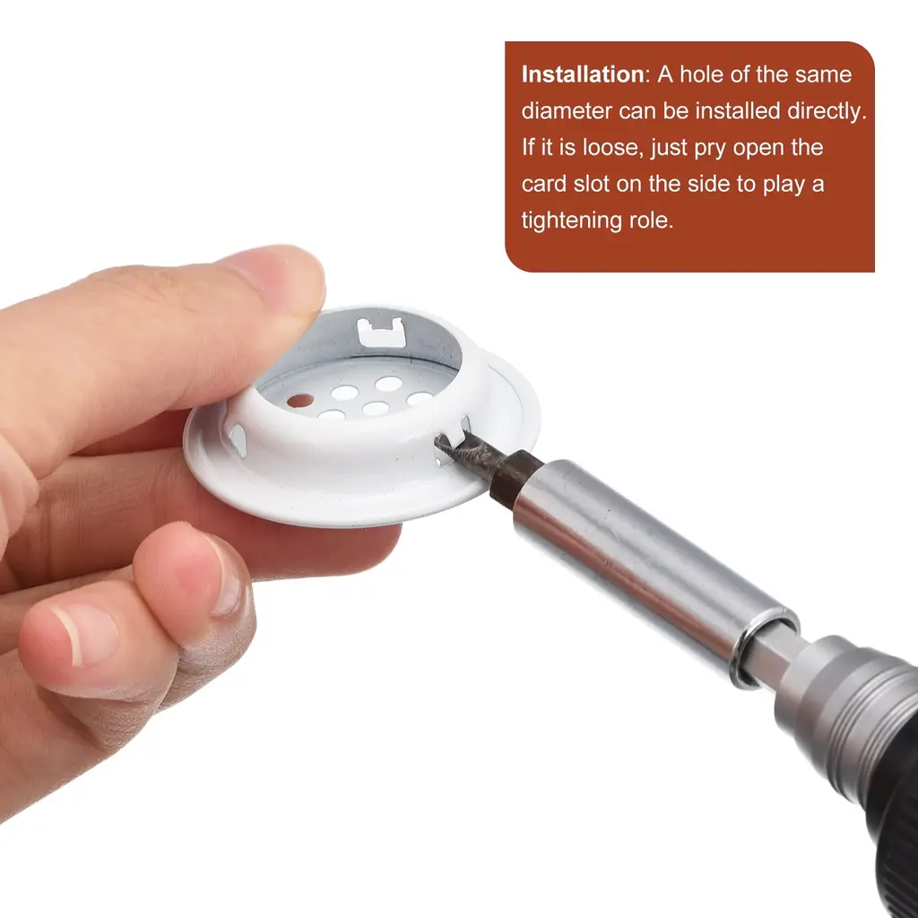 Description:1. Material: The round air vent is made of stainless steel, rust and corrosion-resistant, durable, and strong ability to withstand gravity, not only anti-oxidation but also a more beautiful installation effect.2. Design: The exhaust hole is designed with round mesh. The 3mm small round hole can be dust-proof and not easily blocked.3. Installation: A hole of the same diameter can be installed directly. If it is loose, just pry open the card slot on the side to play a tightening role.4. Application: A circular soffit vent is suitable for cabinets, shoe cabinets, wardrobes, TV cabinets, drawers, etc., and is widely used in offices, bathrooms, kitchens and other furniture needed to exhaust the occasion.Specification:Color: WhiteMaterial: Stainless SteelOutside Diameter: 34mm / 1.34"Bottom Diameter: 25mm / 0.98"Mounting Height: 9mm / 0.35"Package Content: 20pcs x Circular Soffit Vents