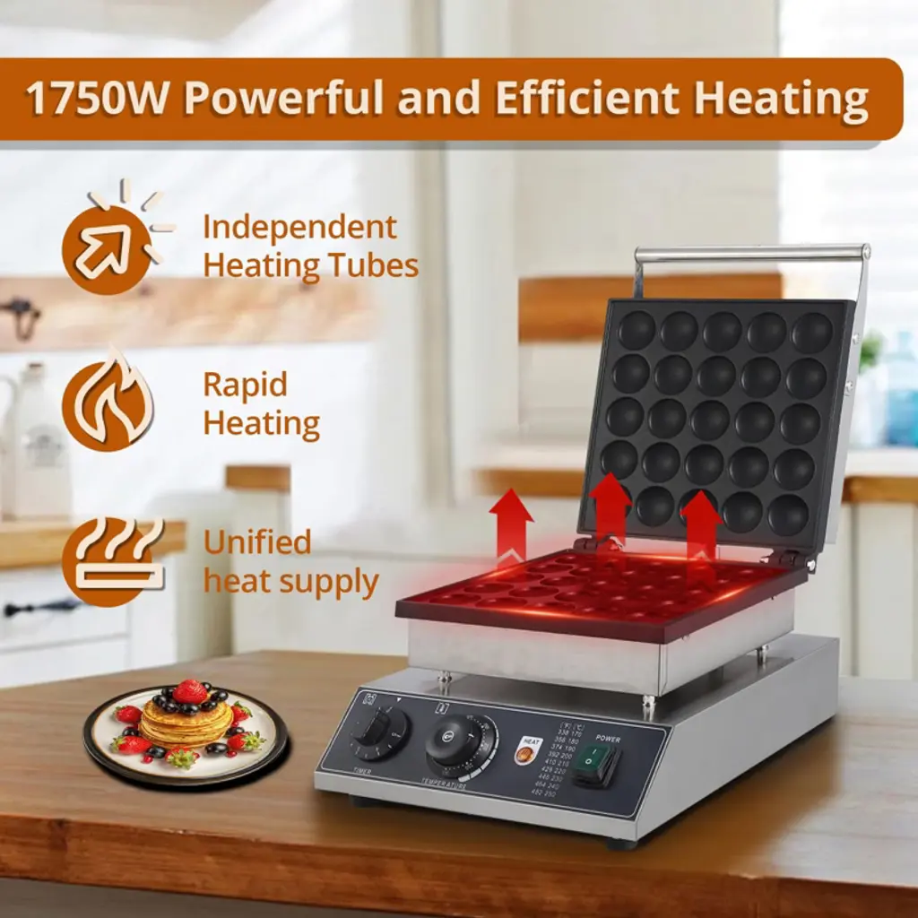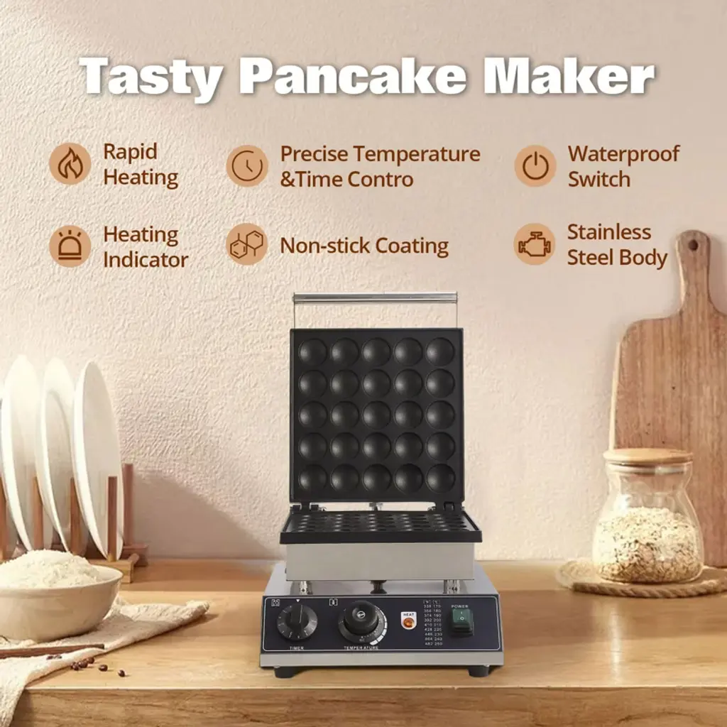 Designed for efficiency and precision, this commercial mini pancake maker produces 25 perfectly uniform 1.8" Dutch pancakes in just 3-5 minutes. The advanced circular heating system ensures rapid preheating (5-10 minutes) for consistent results.Built with professional-grade materials, the unit features durable stainless steel housing and Teflon-coated cast aluminum plates for superior nonstick performance. The intuitive control panel includes separate temperature adjustment and a 5-minute timer dial, making operation simple for both home cooks and food service professionals.Safety-conscious design elements include heat-resistant handles, non-slip rubber feet, and a secure lid for optimal heat retention. Ideal for creating bite-sized pancakes, muffins, and other snacks, this versatile appliance serves equally well in home kitchens, cafes, dessert shops, and convenience stores. The compact yet sturdy construction delivers commercial reliability with easy wipe-clean maintenance.