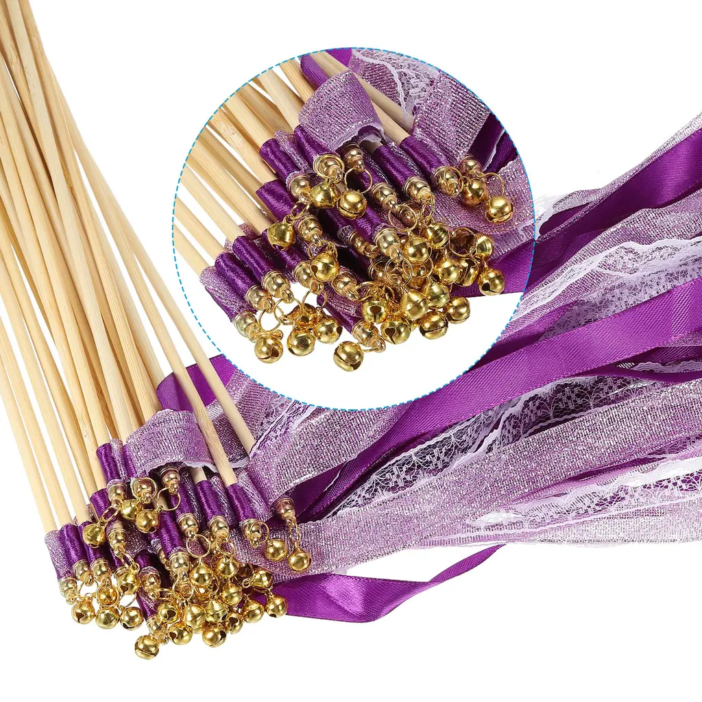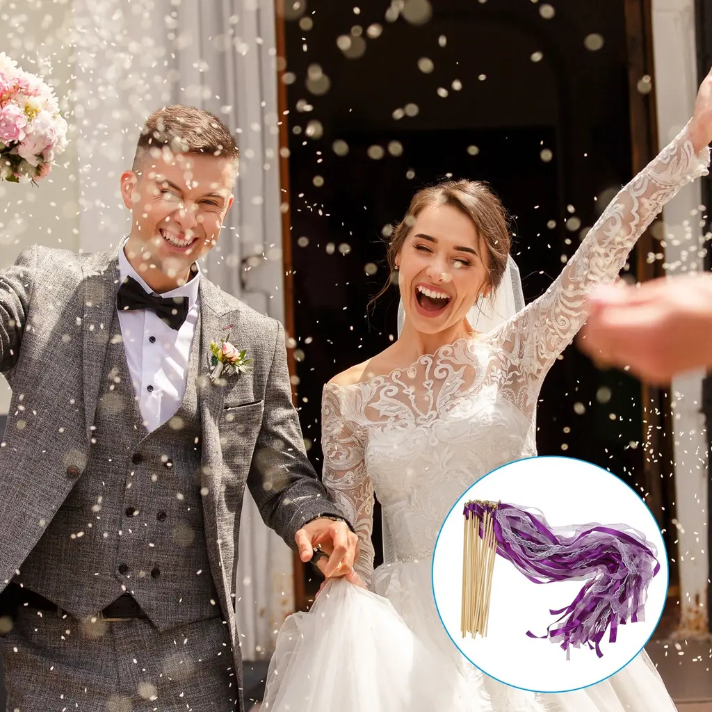 The beautiful and romantic fairy wands can add a magical touch to weddings, bridal showers, send off, birthdays, party favors, other special events; Also a fun accessory for costumes, dress-up play, or cheerful holiday celebrations.Specification Color: PurpleMaterial: Silk Ribbon, Lace, WoodRibbon Length: 60cm / 23.6 inchStick Length: 30cm / 11.8 inchPacking List: 25Pcs x Decorative Ribbon Fairy WandsAdvantageThe fairy stick wand is made of lightweight satin ribbon and lace, with a wooden wand handle is comfortable to hold and wave around. The colorful ribbons create an enchanting and playful appearance.InstructionHold the wand by the handle, ensuring a secure grip. Wave the wand gently in the air to create flowing movements with the ribbons.NOTE: Keep them away from open flame or heat sources to prevent damage. Ensure that the ribbons are securely attached to the wand to avoid potential harm.