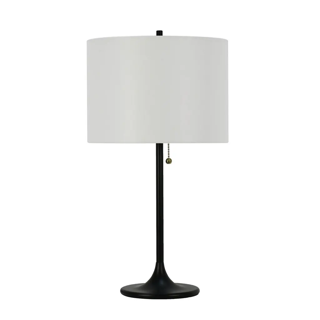 This 26.5" metal European design table lamp is shown in black. Its styling and finish will coordinate with transitional furnishings to work in every room. Showcase your brilliant tastes through this simple chic look with elongated trumpet flair base while accenting your favorite decor. The white linen shade is a perfect compliment. The lamp comes with an easy pull chain switch, uses one 100W bulb (not included), and is UL & CSA listed.