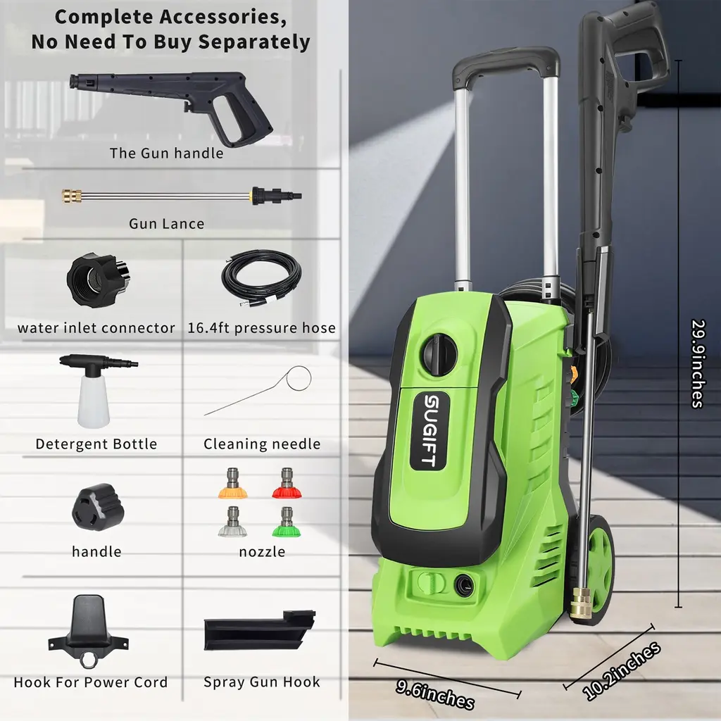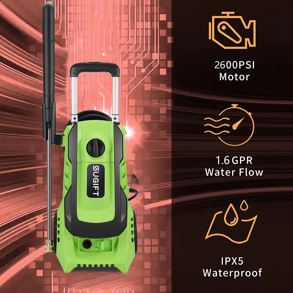Our pressure washer is the result of years of innovation and continuous improvement, built on a solid foundation and demonstrating formidable strength. Capable of tackling a wide array of cleaning tasks, it is perfect for homes, buildings, RVs, cars, trucks, boats, decks, driveways, patios, and lawn equipment. Experience the optimal blend of power, performance, and versatility with our pressure washer's 1800-Watt/14.5 Amp motor, which generates up to 2600 psi of water pressure and 1.8 GPM of water flow. Effortlessly remove tar, grease, heavy mildew stains, oil stains, rust, caked mud, and other stubborn dirt and grime. The electric pressure washer consistently delivers impressive results.