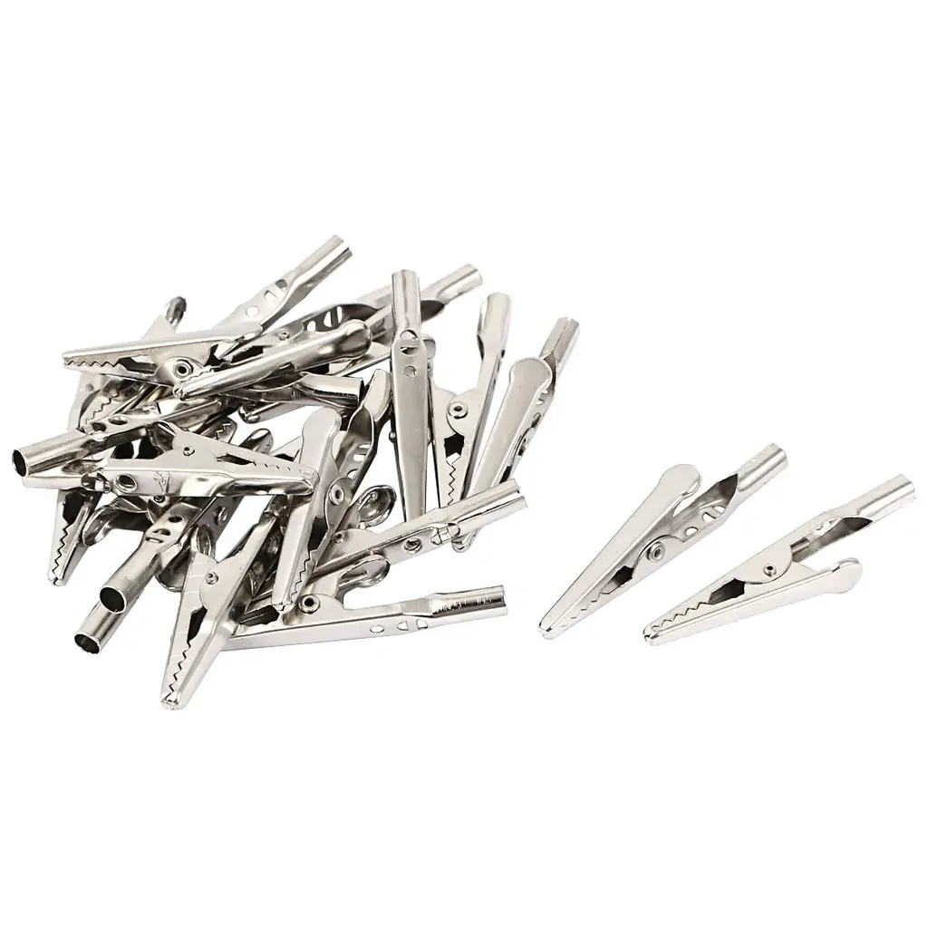 Product Name : Alligator Test Clips;Application : Testing WorkTotal Size : 55x 23mm/2.1" x 0.9"(L*Max.D);Jaw Open Width : 10mm / 0.4" (Max.)Color : Red,Silver Tone, Black;Material : Metal, PlasticWeight : 99gPackage : 26pcsx Alligator Test ClipsAlligator clips can be used in electrical or laboratory electric testing work, they are useful for connecting components to wires.Used as miniature clamps to hold parts together for gluing and wires together for soldering.Easy installation and safety for use with the insulation black red soft plastic boots coated.