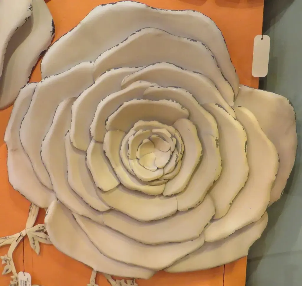 A beautiful alternative to traditional wall art, our large floral blossoms are so versatile. Use them individually, or mix and match the sizes for a stunning grouping. Their three dimensional design adds depth, style, and bit of romance. Handcrafted metal with heavily antiqued cream finish. Three dimensional design lets it stand out from the wallAvailable in several sizes - mix and match to create a gorgeous groupingSize: 27'''' H x 27'''' W x 3. 5'''' Deep Weight: 10. 2 lbs. Heirloom Quality - Expertly hand crafted and hand finished Due to the hand crafted nature of this piece, each piece may have subtle differences.