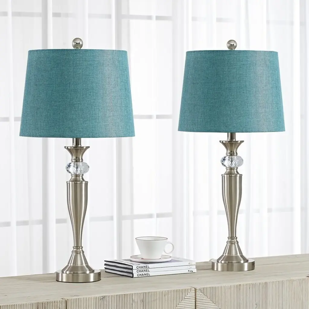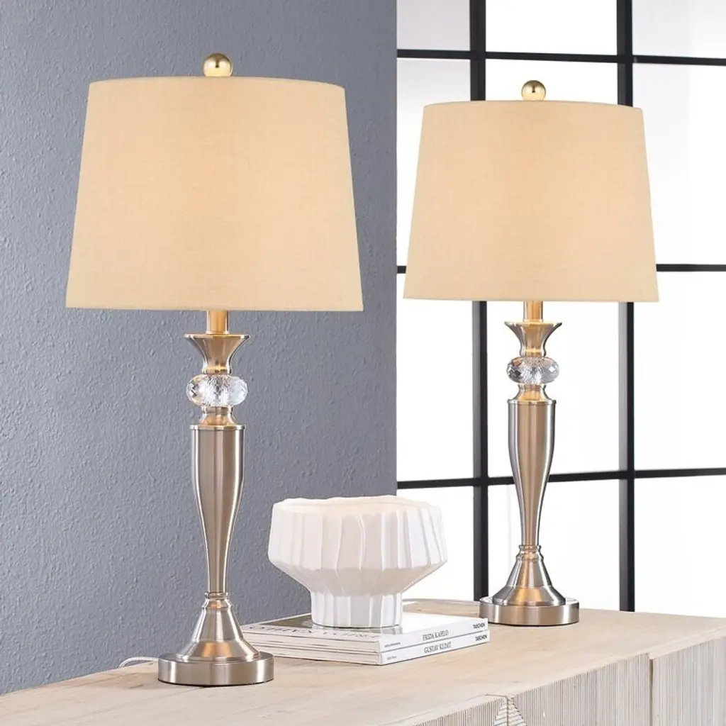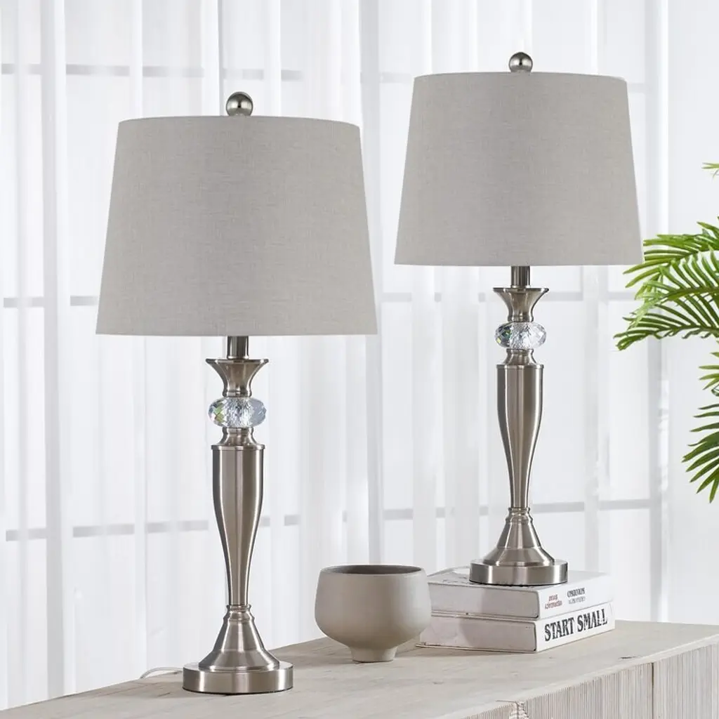 Add sleek modern style to your living space with this pair of table lamps. The base is made from metal in a nickel finish and has an eye-catching hourglass shape. We love the crystal bulb at the base of the fixture that catches and reflects the light around your room artfully. The empire shade is made from 100% linen and a finial peaks out from the top. The three-way switch allows you to determine the brightness of the light from the 100-watt bulb, sold separately. This pair of table lamps complete the look of your bedroom or living room. Features: