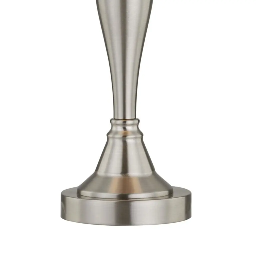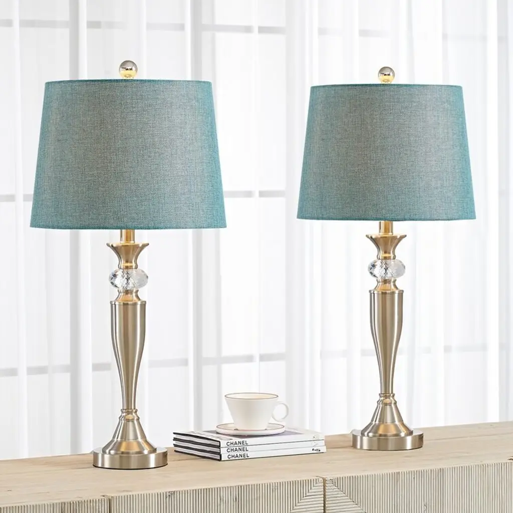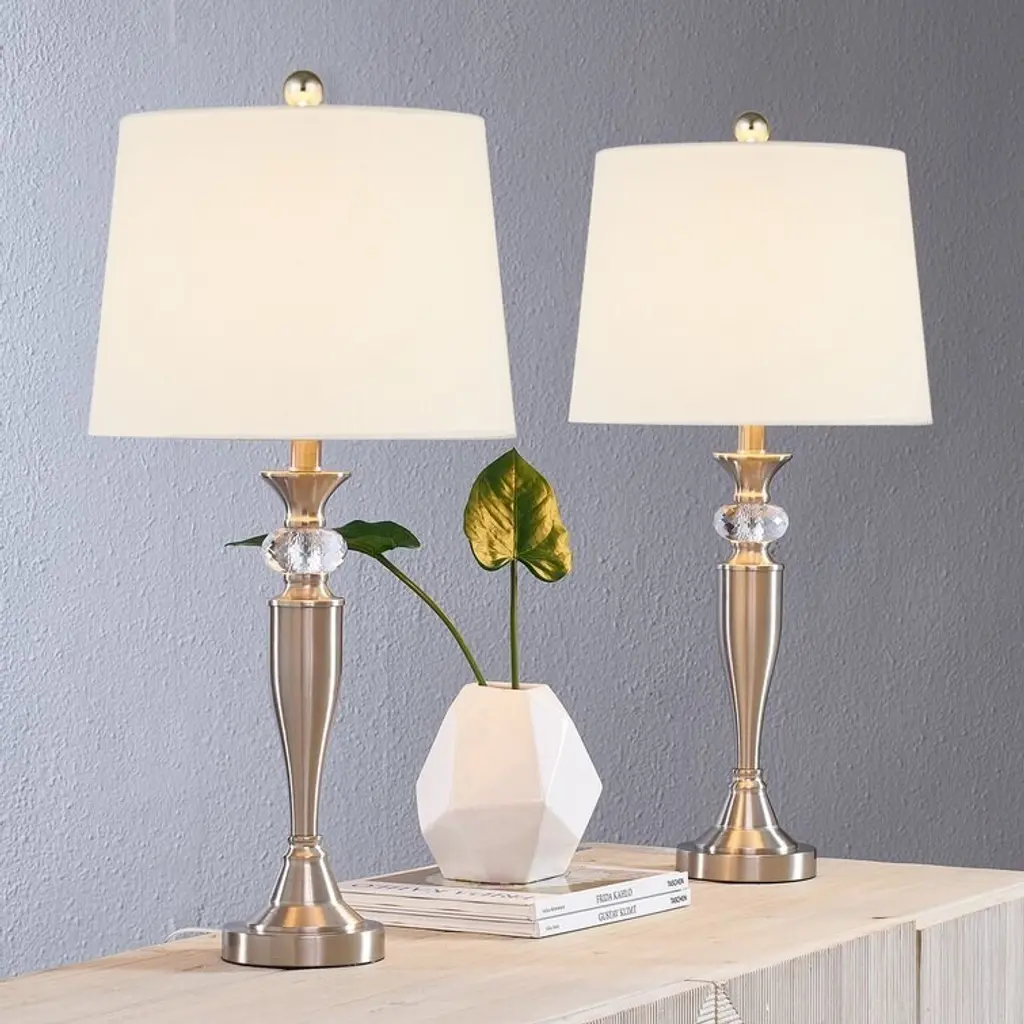 Add sleek modern style to your living space with this pair of table lamps. The base is made from metal in a nickel finish and has an eye-catching hourglass shape. We love the crystal bulb at the base of the fixture that catches and reflects the light around your room artfully. The empire shade is made from 100% linen and a finial peaks out from the top. The three-way switch allows you to determine the brightness of the light from the 100-watt bulb, sold separately. This pair of table lamps complete the look of your bedroom or living room. Features: