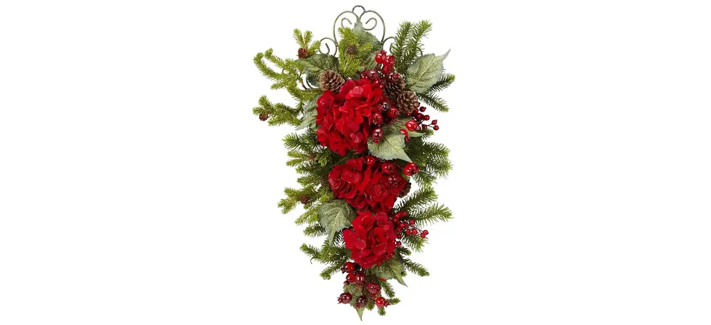 You will be amazed by the beauty of this teardrop. It has a combination of frosted berries, pine cones and pine sprigs and pine needles. Completely wired for easy shaping, this teardrop also comes with loop for easy hanging.