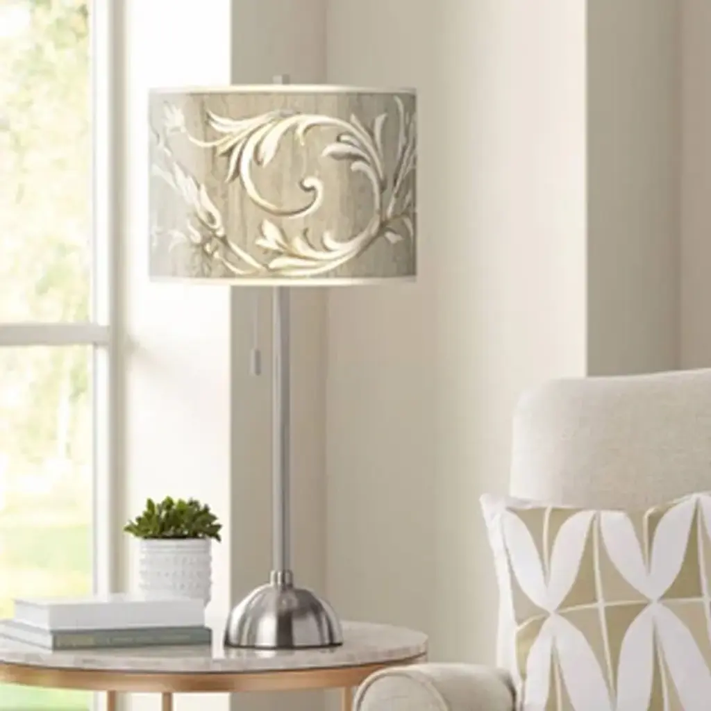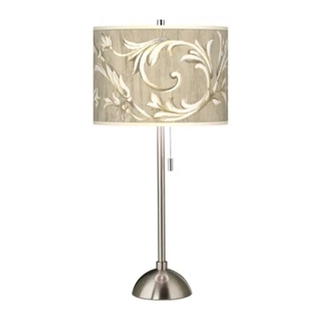 28" high overall. Drum shade is 13 1/2" wide across the top and bottom x 10" high. Weighs 5.2 lbs. Uses one maximum 100 watt standard-medium base light bulb (not included). On-off pull chain switch for easy lighting control. Custom-made to order Laurel Court pattern lamp shade is giclee printed on a translucent canvas fabric. Shade printing process U.S. Patent # 7,347,593. Brushed nickel finish table lamp base. Metal construction. 8-foot long cord. Features trending lamp bases with made to order designer lamp shades. This contemporary table lamp base features a drum lamp shade with the exclusive Laurel Court pattern. The shade is printed giclee style on a canvas material and is made to order. The base is in a brushed nickel finish, and the lamp has an an on-off pull chain for convenient lighting control. Shade printing process U.S. Patent # 7,347,593. Use to add a bright accent to a bedside table or use for living room lighting.